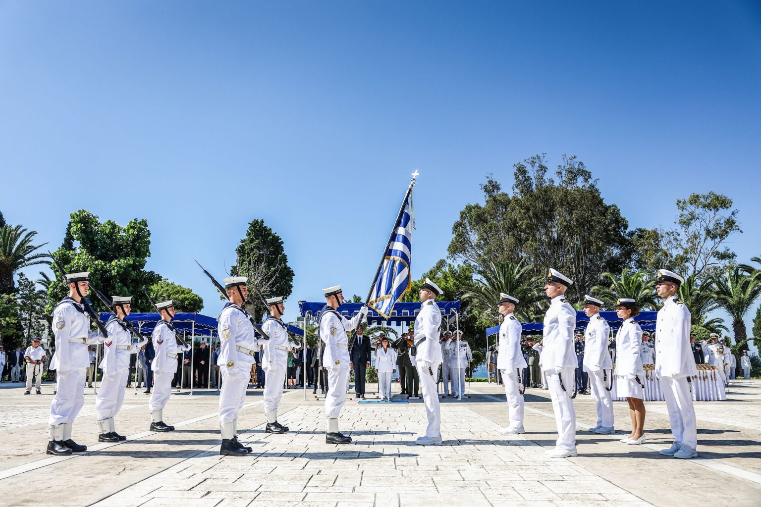 Στην τελετή ορκωμοσίας στη Σχολή Ναυτικών Δοκίμων 28/06/2023 Η Πρόεδρος της Δημοκρατίας Κατερίνα Σακελλαροπούλου παρέστη στην τελετή ορκωμοσίας στη Σχολή Ναυτικών Δοκίμων και απένειμε τα ξίφη στους νέους Σημαιοφόρους του Πολεμικού Ναυτικού και