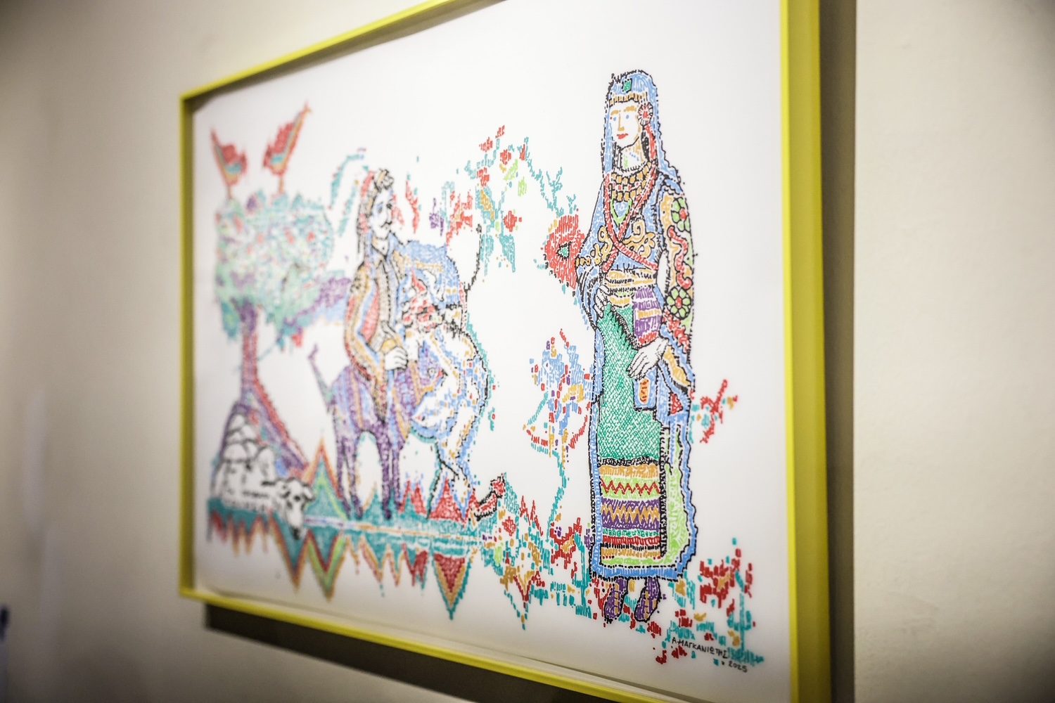 Αυτή η έκθεση έχει ένα πολύ ενδιαφέρον οδοιπορικό. Θα μπορούσαμε να το αποκαλέσουμε το οδοιπορικό της διαρκούς και αλλαγμένης έμπνευσης. Έρχεται από τη Θεσσαλονίκη, μετά έρχεται από τη Λάρισα, όπου εμπνεύστηκε από τα υφαντά της Θεσσαλίας, ενώ προηγουμένως στη Θεσσαλονίκη εμπνεύστηκε από τα υφαντά της Ουρανούπολης και του Πύργου. Τώρα εμπνέεται από τα υφαντά τα δικά μας, της δικής μας περιοχής, της Ηπείρου, των Ιωαννίνων, του Μετσόβου. Ακολουθεί, νομίζω, η Καλαμάτα, η Θράκη και αυτό το οδοιπορικό εμπνεύσεως καταλήγει στο εμβληματικό Καπνεργοστάσιο στην Αθήνα.