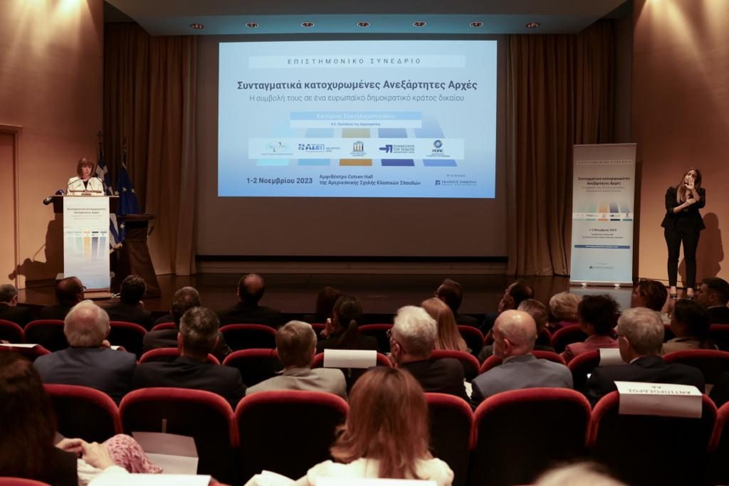 Η Πρόεδρος της Δημοκρατίας Κατερίνα Σακελλαροπούλου κήρυξε την έναρξη των εργασιών του συνεδρίου που διοργανώνουν από κοινού οι πέντε συνταγματικά κατοχυρωμένες Ανεξάρτητες Αρχές, στην Αμερικανική Σχολή Κλασικών Σπουδών, με τίτλο «Συνταγματικά κατοχυρωμένες Ανεξάρτητες Αρχές: Η συμβολή τους σε ένα ευρωπαϊκό δημοκρατικό κράτος δικαίου».