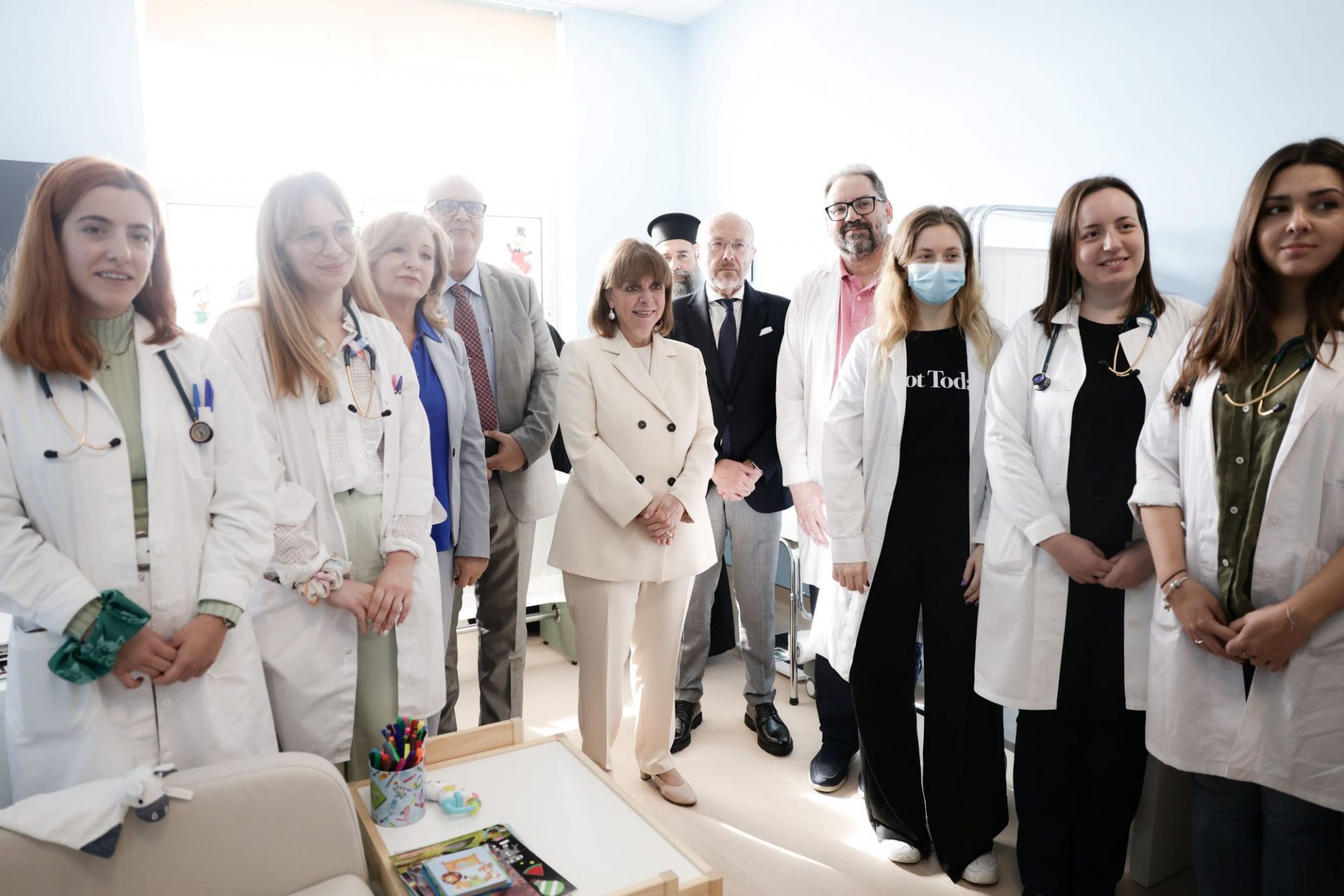 Την Πρόεδρο της Δημοκρατίας υποδέχθηκαν ο Υφυπουργός Υγείας Δημήτρης Βαρτζόπουλος, ο Διευθυντής της Παιδιατρικής Κλινικής Ελπιδοφόρος Μανταδάκης και η Πρόεδρος του Σωματείου «ΕΛΙΖΑ» Μαρίνα Καρέλλα.
