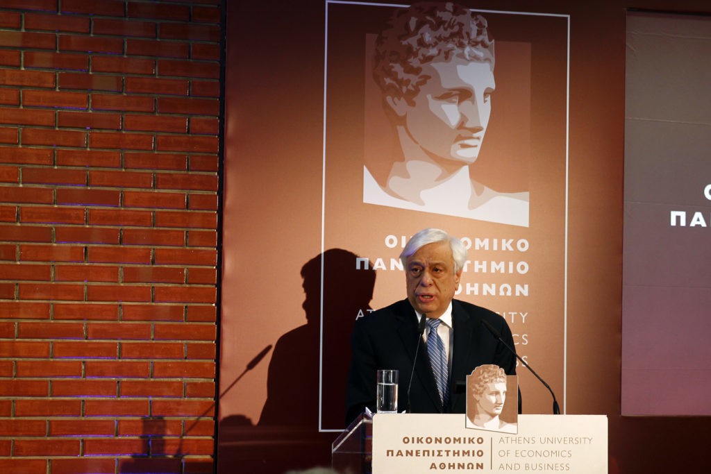 Βρίσκομαι σήμερα εδώ για ν’αποτίσω τον οφειλόμενο φόρο τιμής στην διαδρομή ενός εμβληματικού Ανώτατου Εκπαιδευτικού Ιδρύματος της Χώρας: του Οικονομικού Πανεπιστημίου. Ενός Πανεπιστημίου που αποδεικνύει, ιδίως στις μέρες μας, ότι καμιά κρίση δεν είναι ικανή να κάμψει το φρόνημα των ακαδημαϊκών ανθρώπων, διδασκοντων και διδασκομένων, που θέλουν να εκπληρώσουν την αποστολή τους. Η επιτυχία του Οικονομικού Πανεπιστημίου, η λάμψη του – για να το πω όπως ταιριάζει – δεν αφορά μόνο τους διδάσκοντες και τους διδασκομένους στο Πανεπιστήμιο αυτό. Αφορά την Χώρα. Γι’αυτό βρίσκομαι εδώ, για να τονίοσω ότι ελάχιστη συμπαράσταση είναι αυτή η αναγνώριση και η δέσμευση όλων μας: Πρέπει να κάνουμε τα πάντα για να διευκολύνουμε το έργο των ανθρώπων που από εδώ και πέρα, και μέσα σ’αυτή τη νέα Πτέρυγα, θ’αξιοποιήσουν τις δυνατότητες που έχει η Ελλάδα, η κοινωνία της και ιδίως η νέα γενιά.