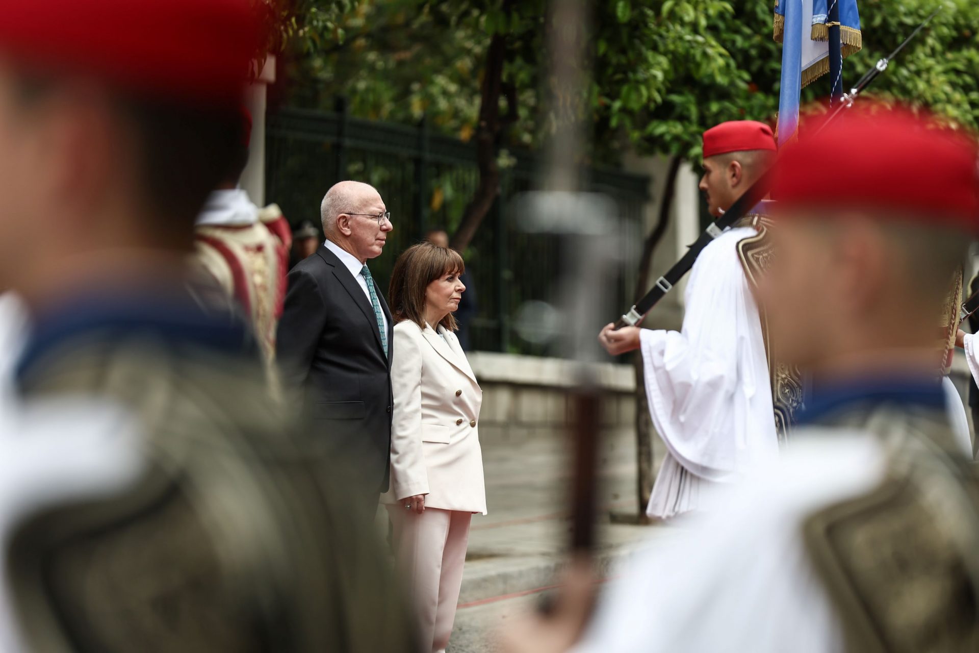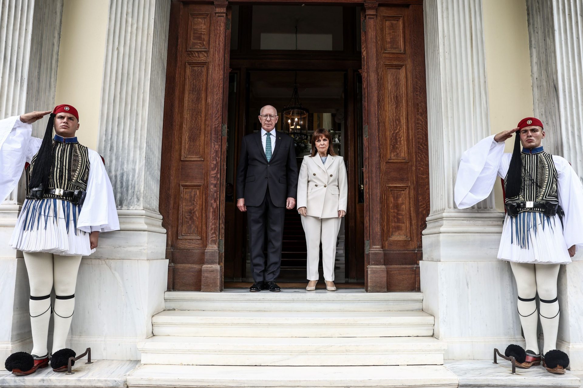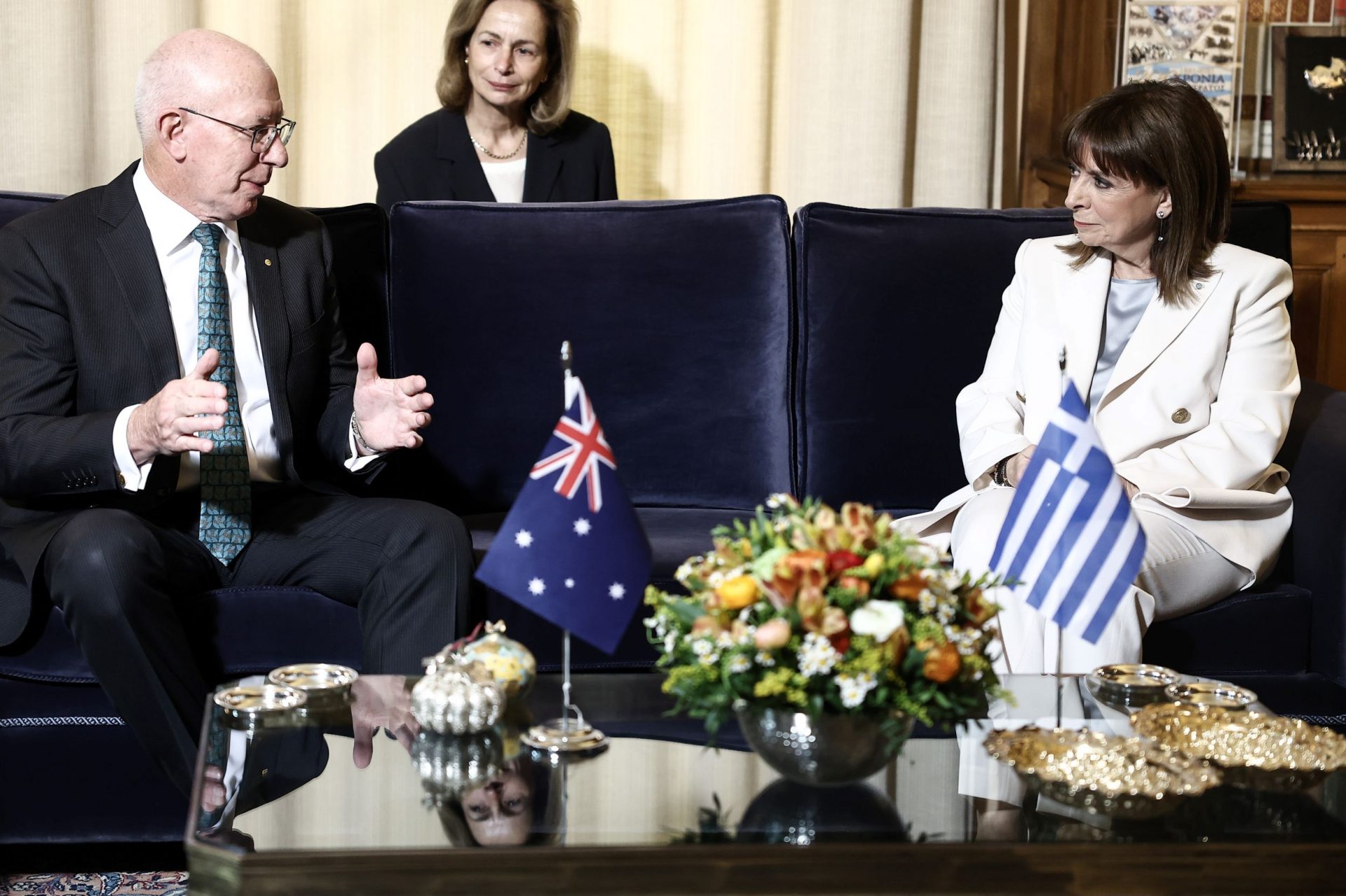 ΚΑΤΕΡΙΝΑ ΣΑΚΕΛΛΑΡΟΠΟΥΛΟΥ: Εξοχότατε, με ιδιαίτερη χαρά σας καλωσορίζω στο Προεδρικό Μέγαρο. Οι σταθεροί δεσμοί φιλίας των δύο χωρών μας χαρακτηρίζονται και εμπλουτίζονται από παραδοσιακή και μακρά φιλία και ενισχύονται από την παρουσία της ελληνικής ομογένειας, η οποία είναι η δεύτερη σε μέγεθος στην υφήλιο. Οι Έλληνες της Αυστραλίας, με τη δυναμική τους παρουσία στο πολιτικό, κοινωνικό, οικονομικό και πολιτισμικό γίγνεσθαι της φίλης χώρας σας, ενδυναμώνουν τις σχέσεις μεταξύ των δύο χωρών μας.