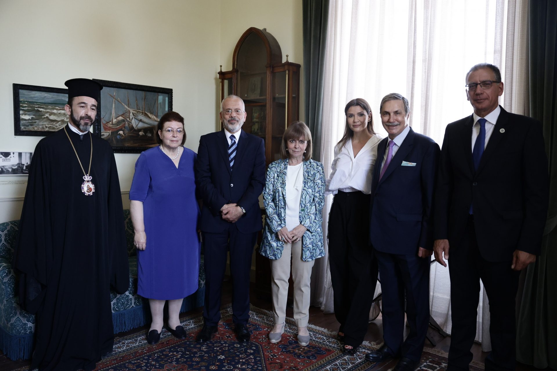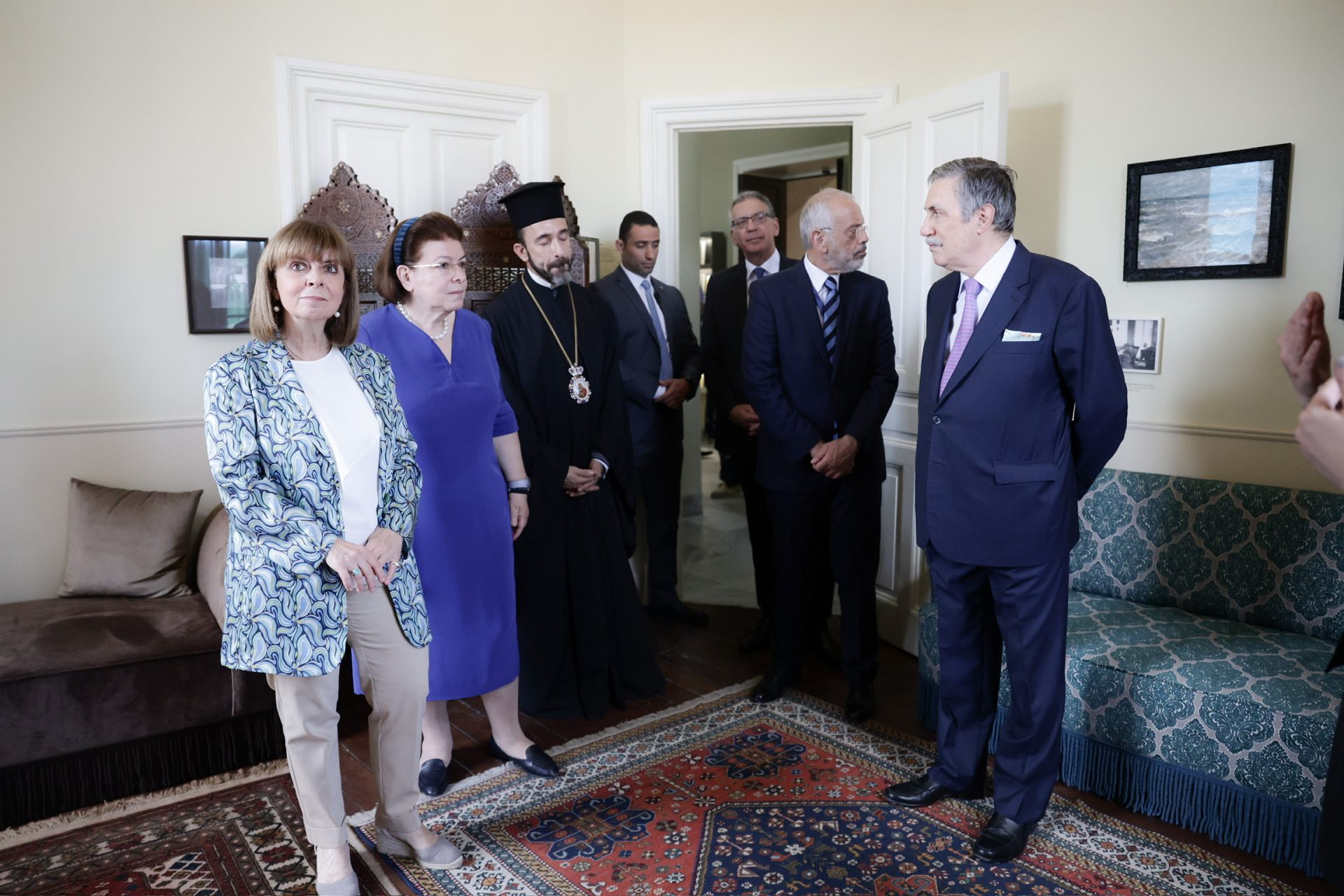 Στη συνέχεια, η Πρόεδρος της Δημοκρατίας, η Υπουργός Πολιτισμού Λίνα Μενδώνη και ο Πρόεδρος του Ιδρύματος Ωνάση Αντώνης Σ. Παπαδημητρίου ξεναγήθηκαν στην οικία από την υπεύθυνη του Αρχείου Καβάφη Μαριάννα Χριστοφή.
