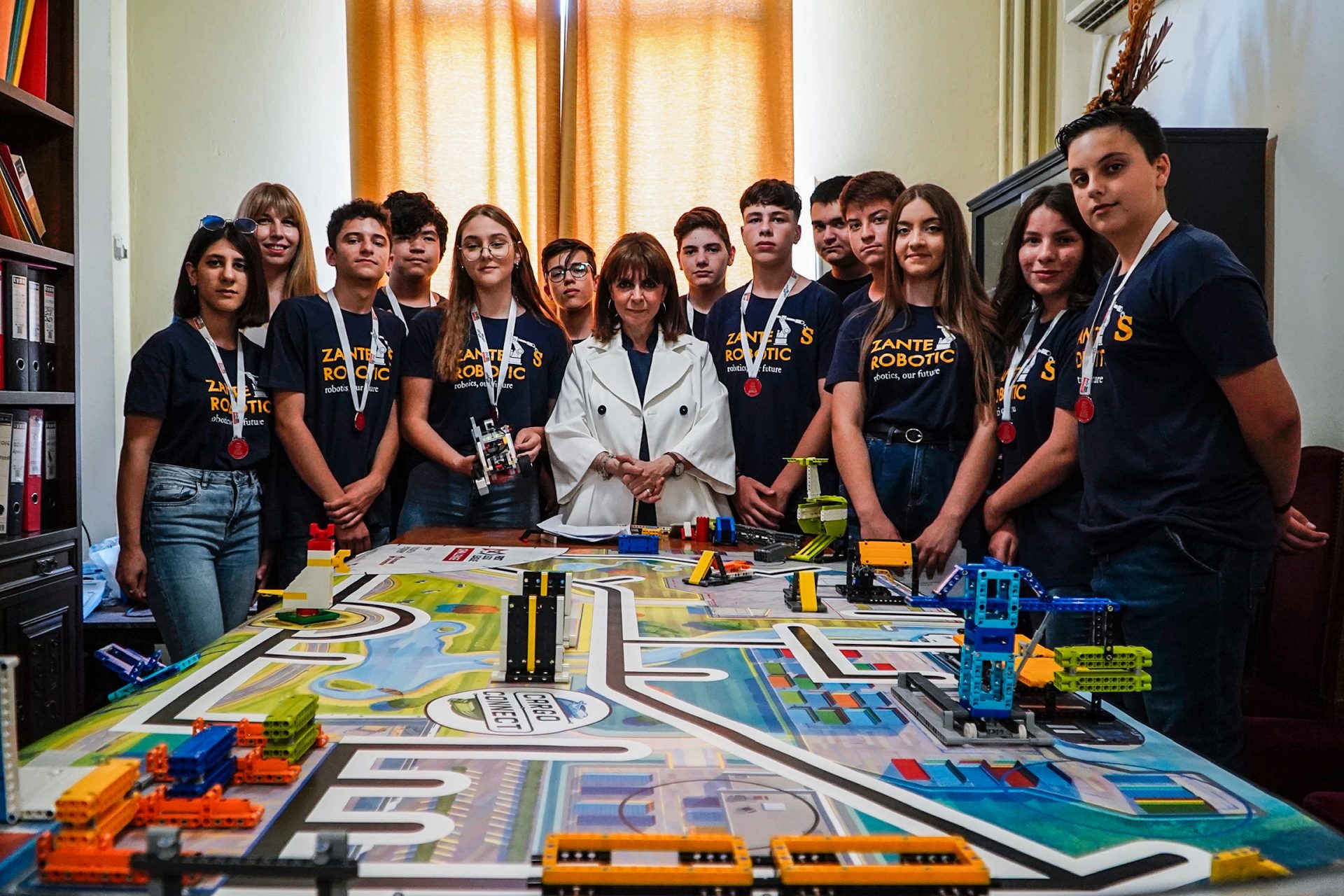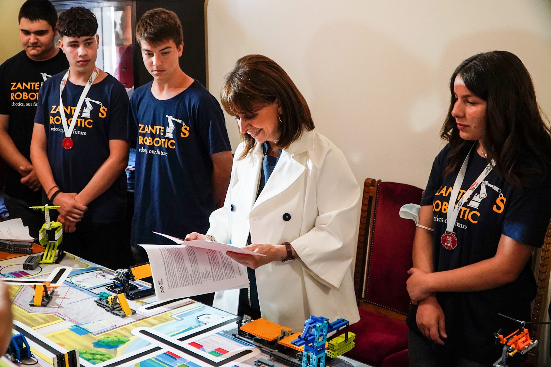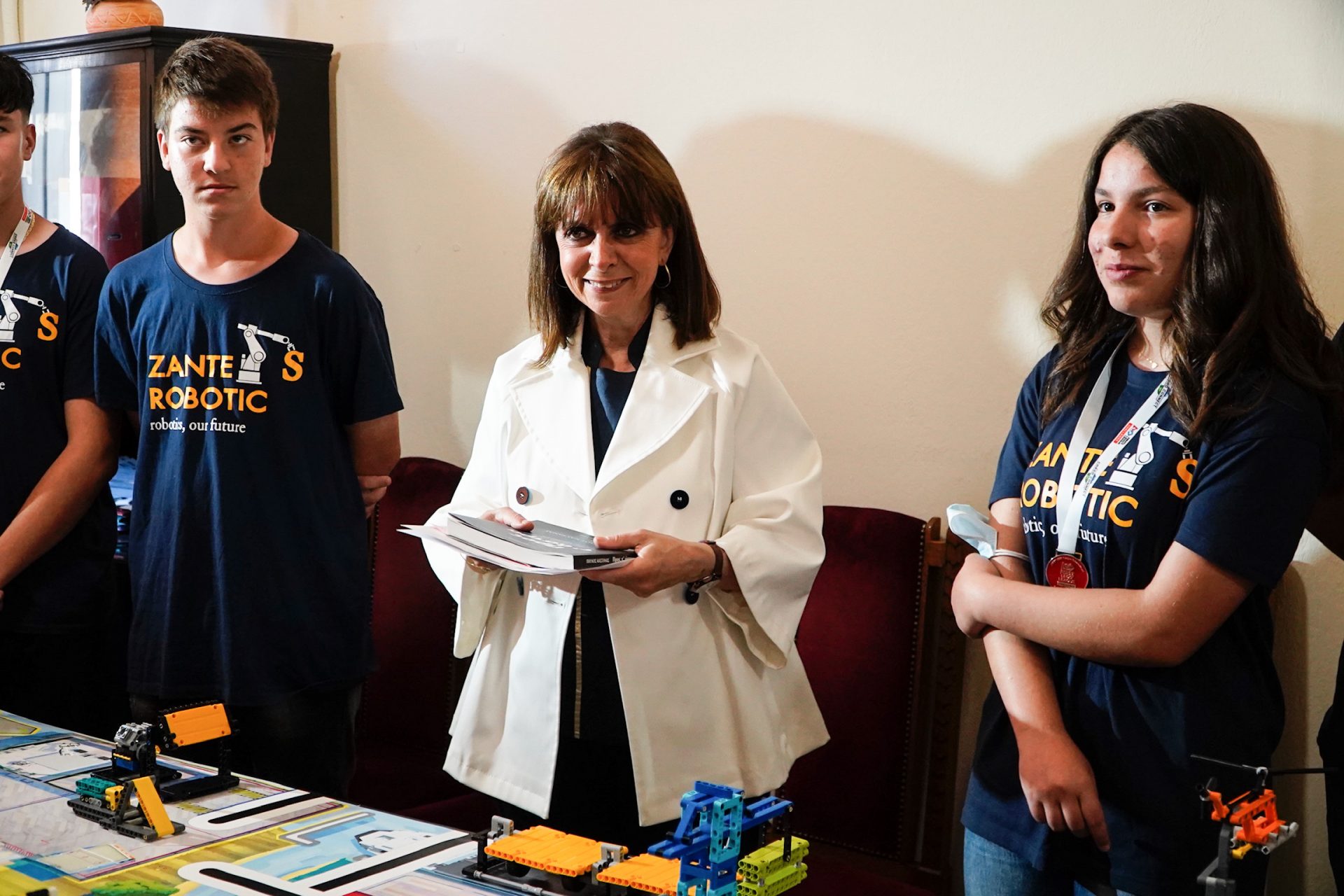 Η Πρόεδρος της Δημοκρατίας Κατερίνα Σακελλαροπούλου, στο πλαίσιο της επίσκεψής της στην Ζάκυνθο, συναντήθηκε με τις τοπικές αρχές στην Περιφερειακή Ενότητα Ζακύνθου και με τους μαθητές του 3ου Γυμνασίου που διακρίθηκαν στο πρόσφατο Πανελλήνιο Πρωτάθλημα Ρομποτικής και Καινοτομίας.