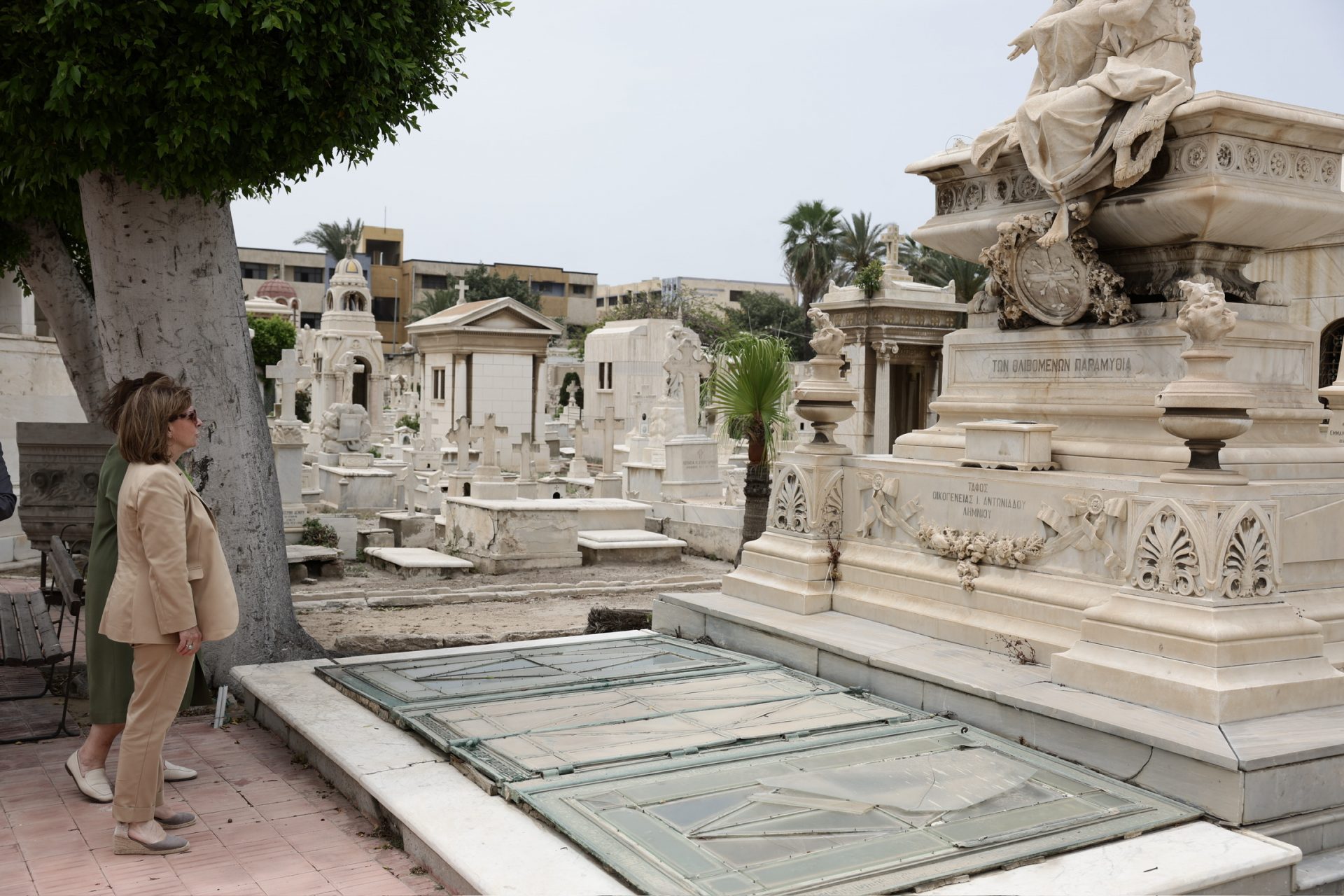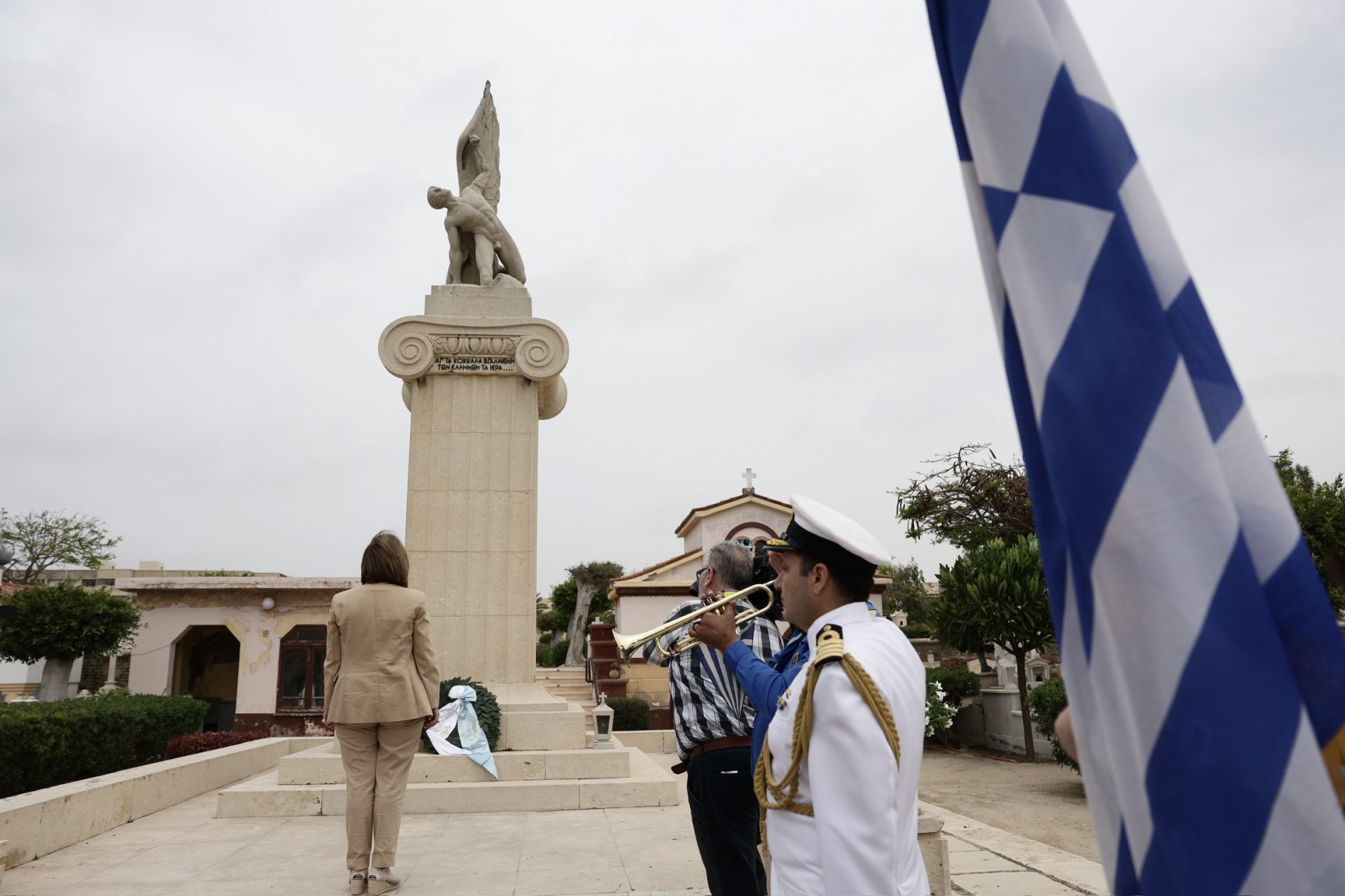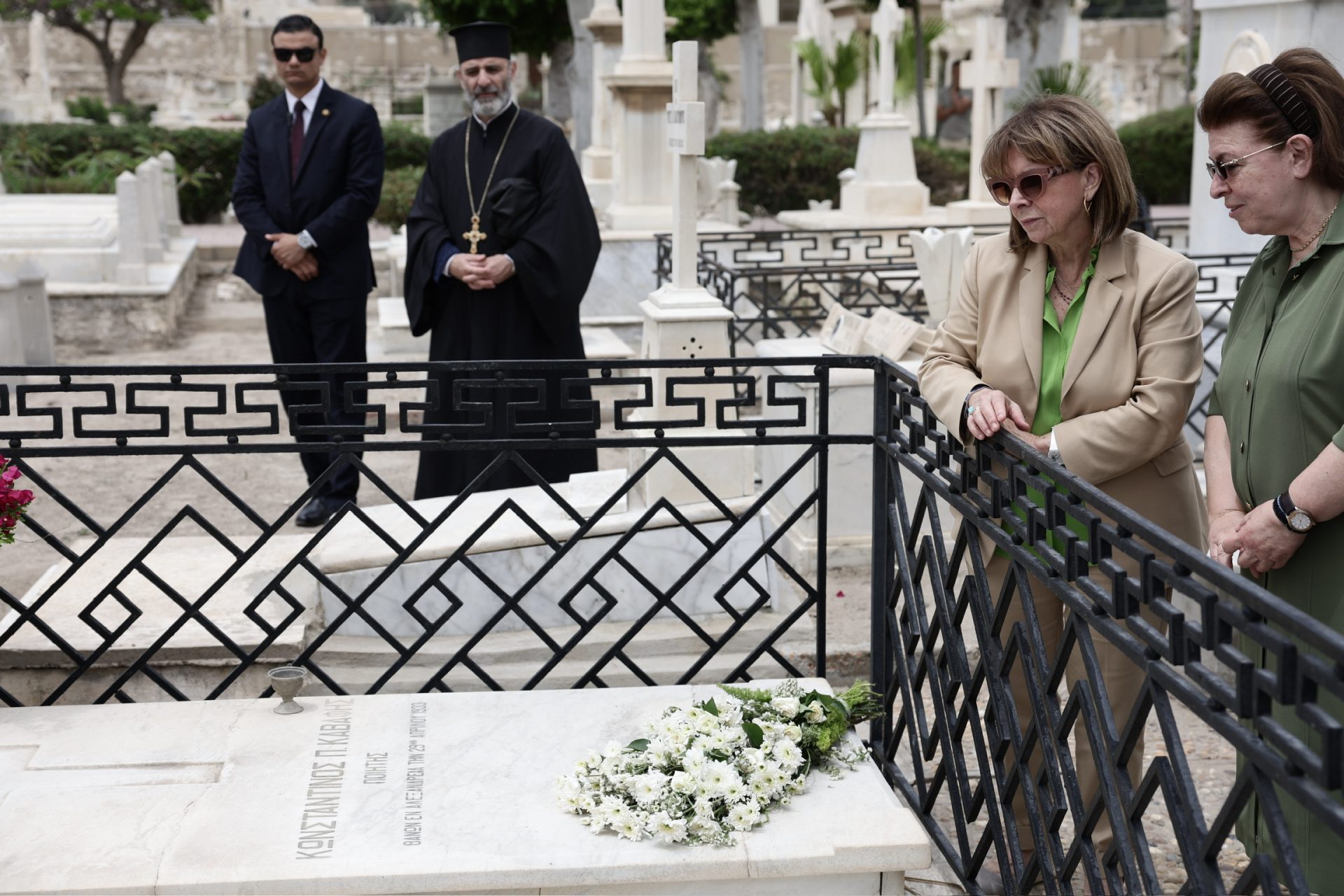 Τέλος, η κυρία Σακελλαροπούλου μετέβη στο Ελληνορθόδοξο Κοιμητήριο, όπου βρίσκεται το μνήμα του ποιητή Κωνσταντίνου Καβάφη και πολλών Αλεξανδρινών ευεργετών, και κατέθεσε στεφάνι στο ηρώο Ελλήνων Ικάρων που έπεσαν στη Μέση Ανατολή κατά τη διάρκεια του Β’ Παγκοσμίου Πολέμου.