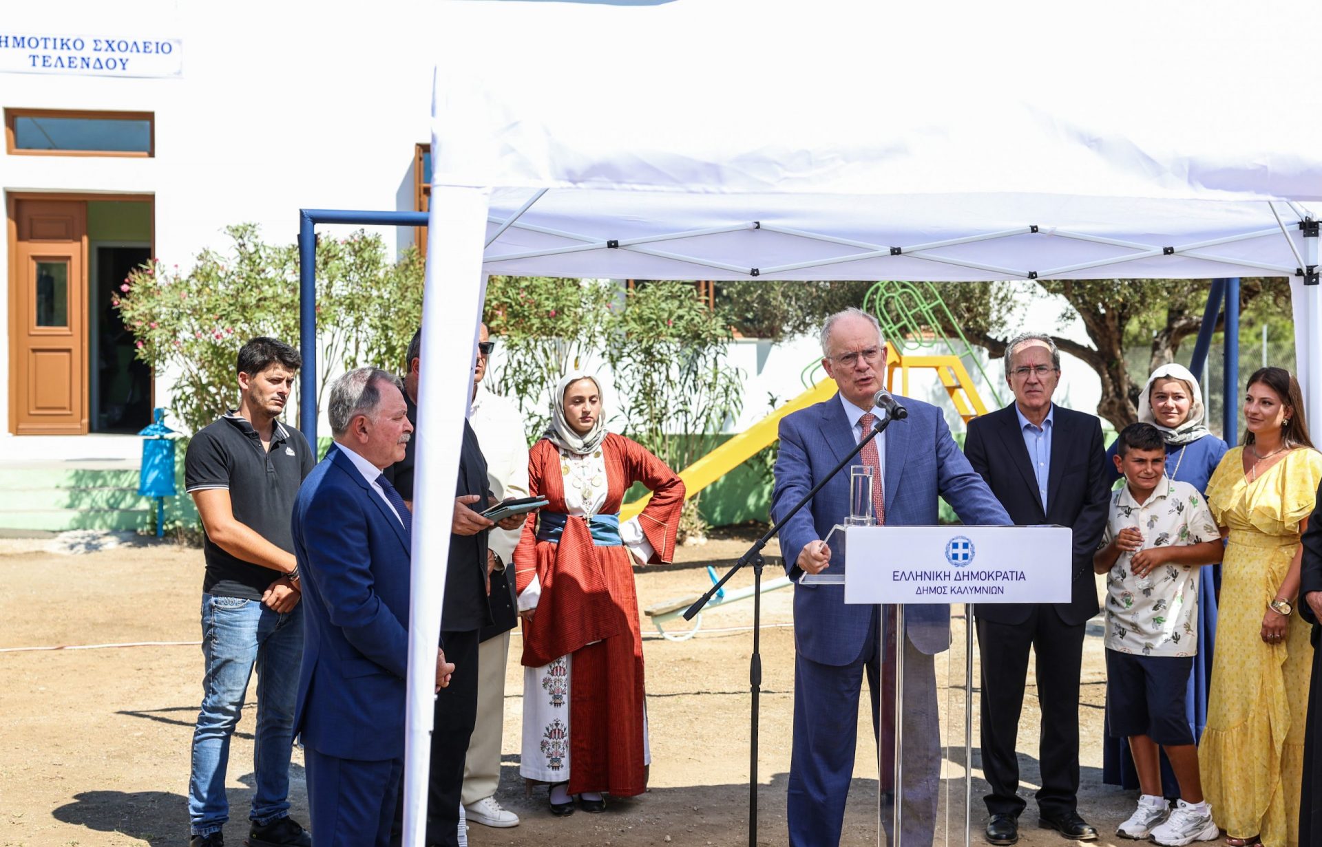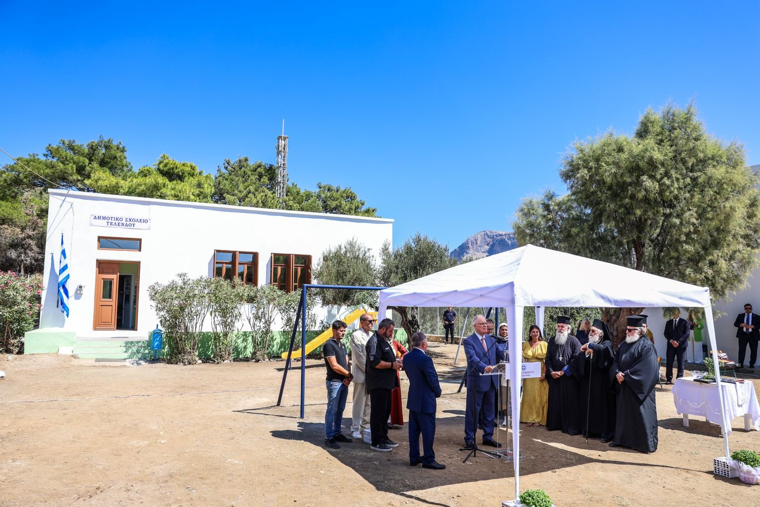 Η παρουσία μου σήμερα εδώ μαζί σας στην Τέλενδο, δυτικά της Καλύμνου, εδώ στον Δήμο Καλυμνίων, στον αγιασμό του μονοθέσιου Δημοτικού Σχολείου της Τελένδου, επιβεβαιώνει ακριβώς, πως η πολιτεία αυτή τη συνταγματική, ηθική και ιστορική της υποχρέωση, που σας ανέφερα προηγουμένως, την εκπληρώνει και την πραγματοποιεί μέχρι την πιο ακραία, μέχρι την πιο ακριτική περιοχή της Ελλάδος.