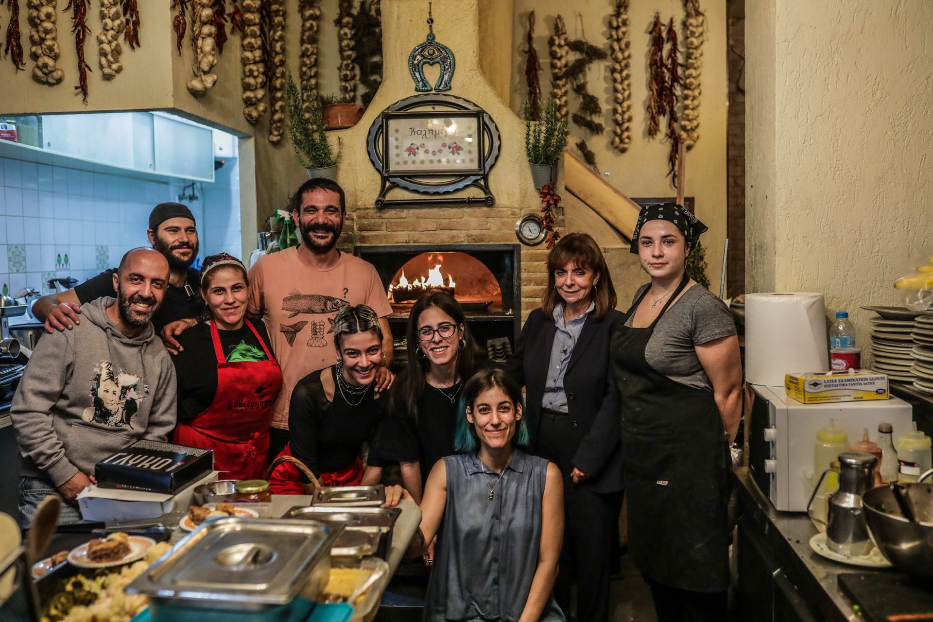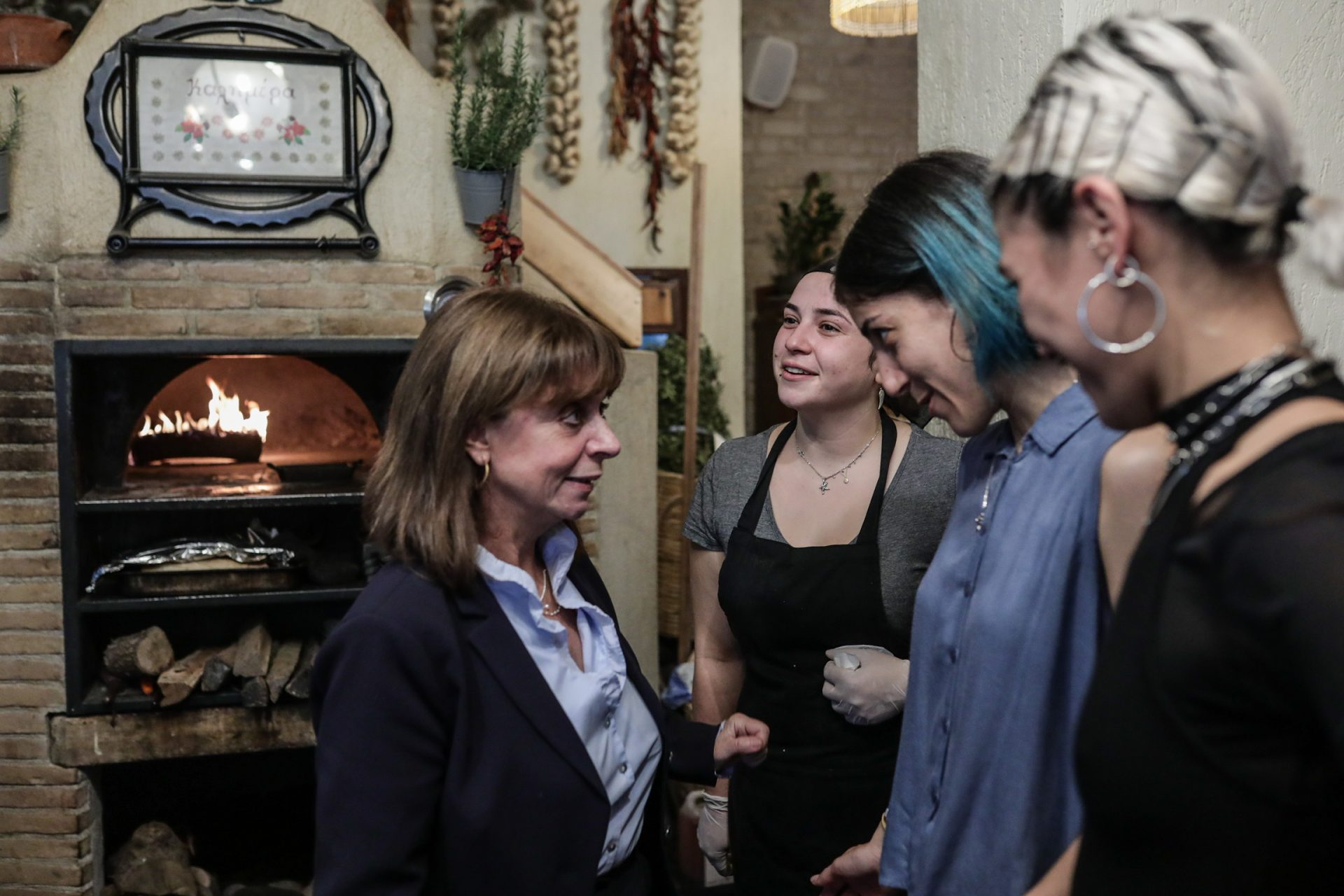 Το μεσημέρι η Πρόεδρος της Δημοκρατίας γευμάτισε στην αγορά Καπάνι, στο βραβευμένο μεζεδοπωλείο «Στου Μήτσου». Το μεζεδοπωλείο ανήκει στον Δημήτρη, ο οποίος είναι απεξαρτημένος και απασχολεί μεταξύ άλλων, πρώην χρήστες ή πρώην κρατούμενους.
