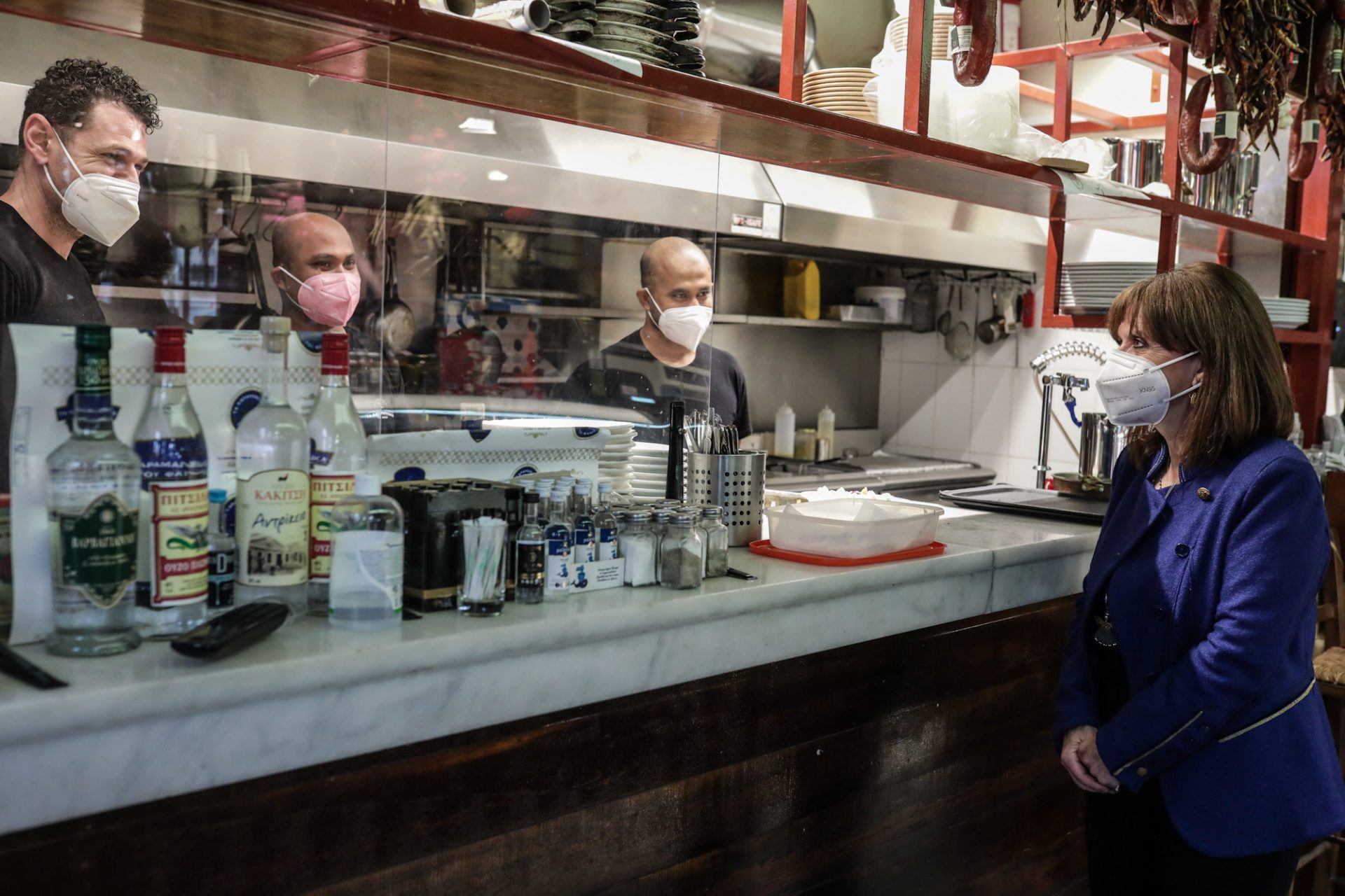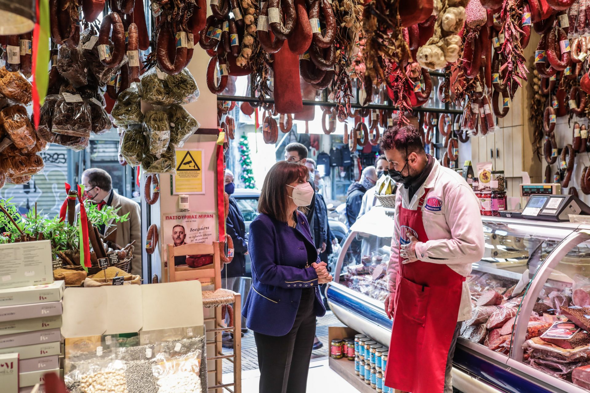 Στη συνέχεια, η κυρία Σακελλαροπούλου έφτασε πεζή στην οδό Ευριπίδου, μίλησε με κόσμο και καταστηματάρχες και γευμάτισε σε μεζεδοπωλείο της περιοχής.