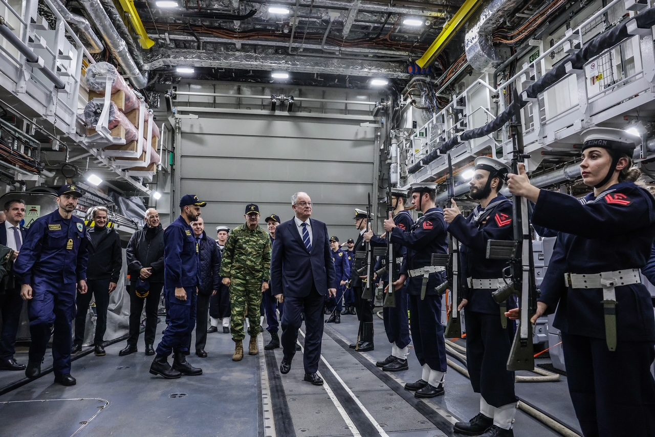 Ο κ. Τασούλας μετέβη στο νέο απόκτημα του Στόλου του Πολεμικού Ναυτικού με ελικόπτερο. Στο ελικοδρόμιο του πλοίου τον υποδέχθηκαν ο Αρχηγός ΓΕΕΘΑ Στρατηγός Δημήτριος Χούπης, ο Αρχηγός ΓΕΝ Αντιναύαρχος Δημήτριος-Ελευθέριος Κατάρας, o Αρχηγός του ΓΕΑ Αντιπτέραρχος Δημοσθένης Γρηγοριάδης, ο Αρχηγός του Στόλου Αντιναύαρχος Χρήστος Σασιάκος και ο Κυβερνήτης του πλοίου Αντιπλοίαρχος Ιωάννης Κιζάνης.