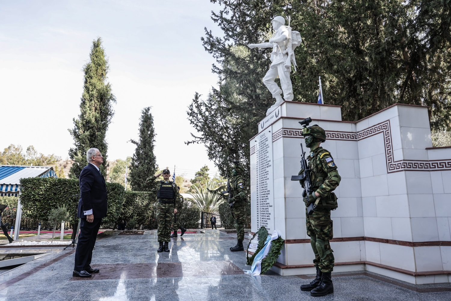 Στη συνέχεια, ο κ. Τασούλας μετέβη στο στρατόπεδο «Αντιστράτηγου Σταυριανάκου» στη Μαλούντα και παρέστη στην τελετή απονομής ηθικών αμοιβών στην πολεμική σημαία της Ελληνικής Δύναμης Κύπρου.
