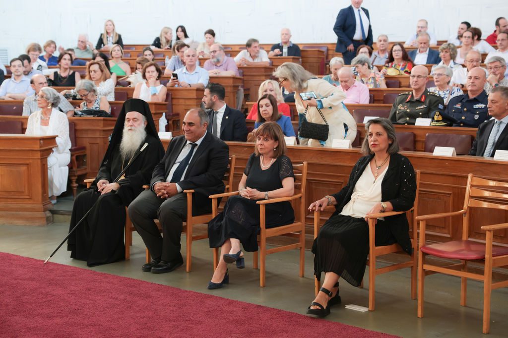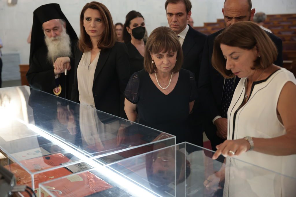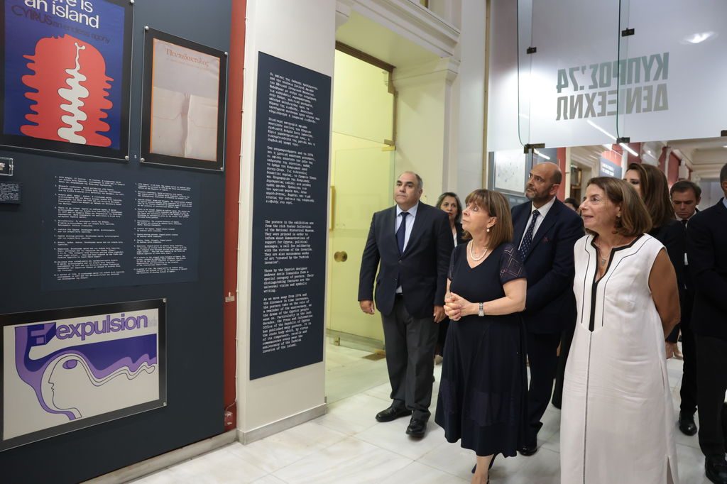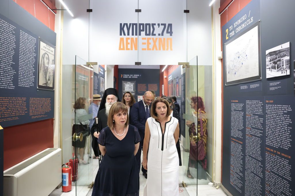 Η Πρόεδρος της Δημοκρατίας Κατερίνα Σακελλαροπούλου εγκαινίασε την έκθεση μνήμης «Κύπρος ’74. Δεν ξεχνώ», που διοργανώνει το Εθνικό Ιστορικό Μουσείο στο Μέγαρο της Παλαιάς Βουλής με αφορμή τη συμπλήρωση 50 χρόνων από την τουρκική εισβολή στην Κύπρο.