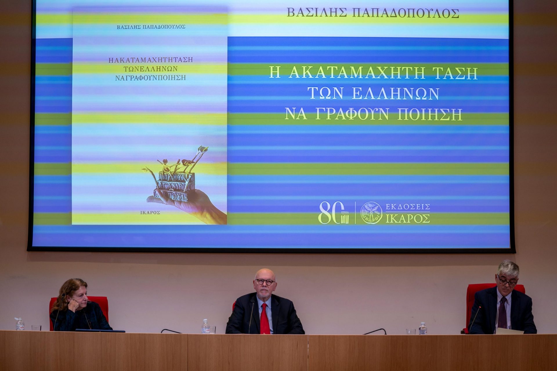 Η Πρόεδρος της Δημοκρατίας Κατερίνα Σακελλαροπούλου παρέστη στην παρουσίαση του βιβλίου του πρέσβη Βασίλη Παπαδόπουλου «Η ακαταμάχητη τάση των Ελλήνων να γράφουν ποίηση», στην Εθνική Πινακοθήκη-Μουσείο Αλεξάνδρου Σούτσου.