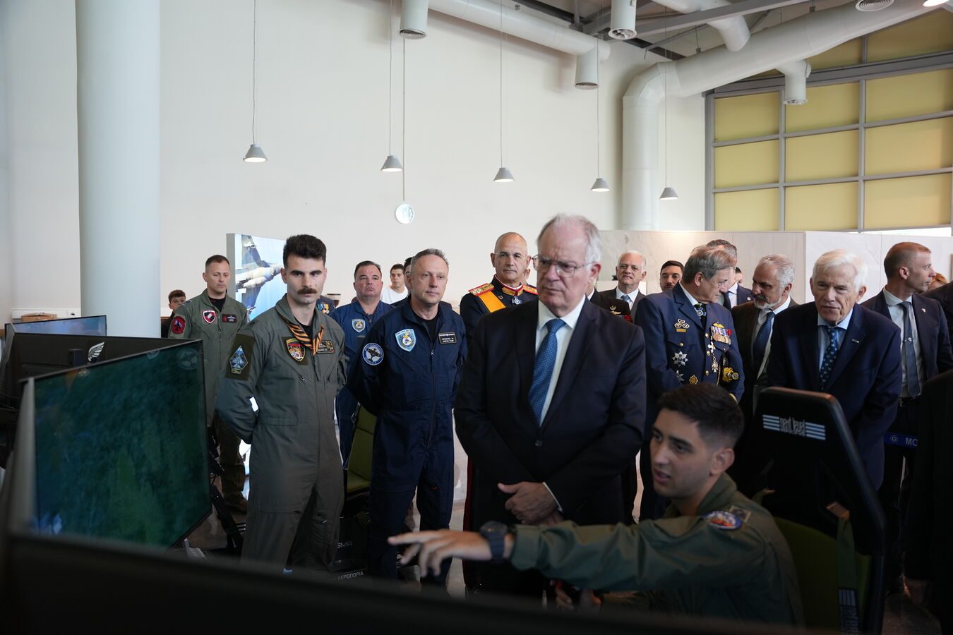 Τον Πρόεδρο της Δημοκρατίας υποδέχθηκαν ο Υφυπουργός Εθνικής Άμυνας Αθανάσιος Δαβάκης, ο Αρχηγός του Γενικού Επιτελείου Εθνικής Άμυνας Στρατηγός Δημήτριος Χούπης, ο Αρχηγός του Γενικού Επιτελείου Αεροπορίας Αντιπτέραρχος Δημοσθένης Γρηγοριάδης και ο Διοικητής της Σχολής Ικάρων Υποπτέραρχος Ματθαίος Κανουπάκης.