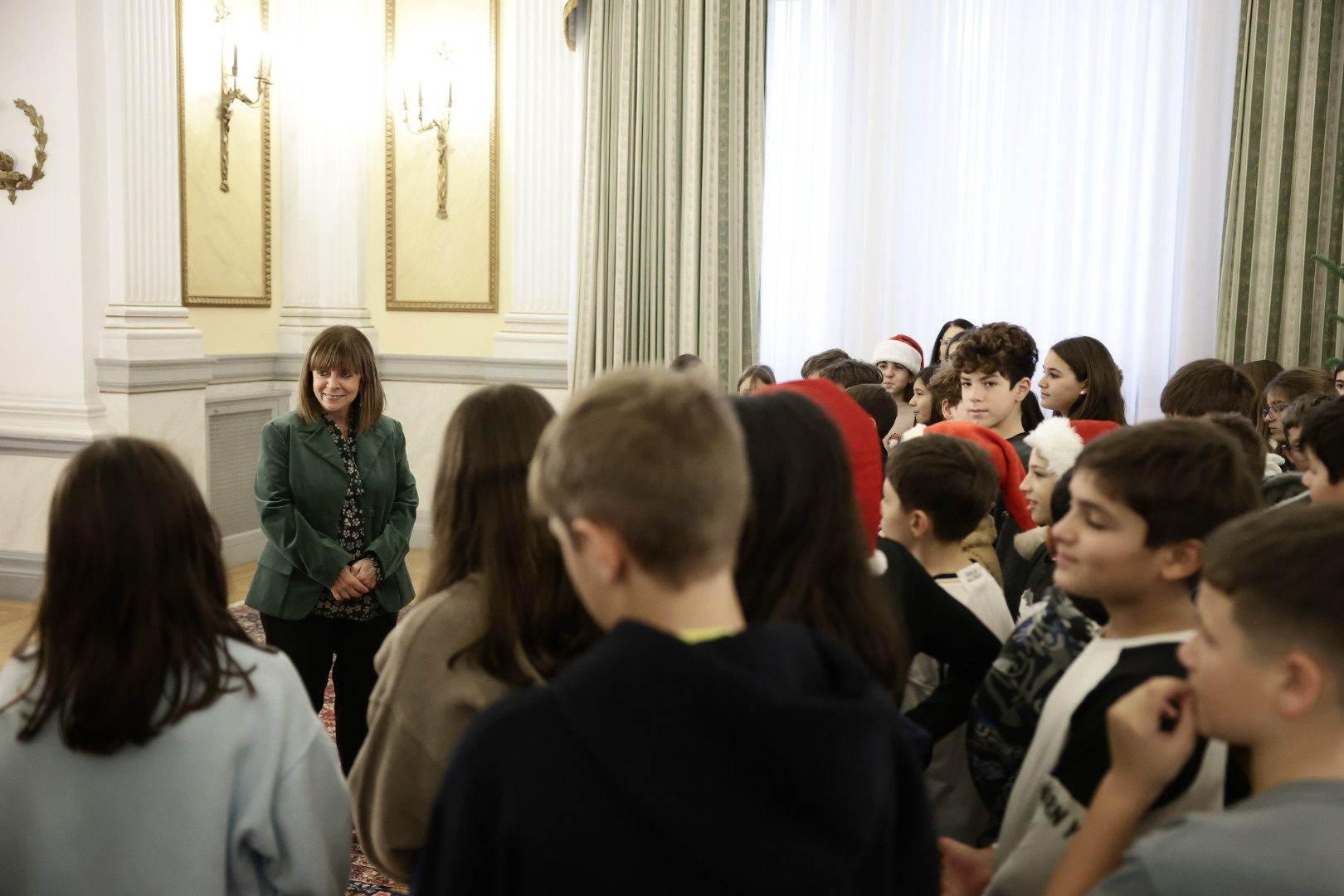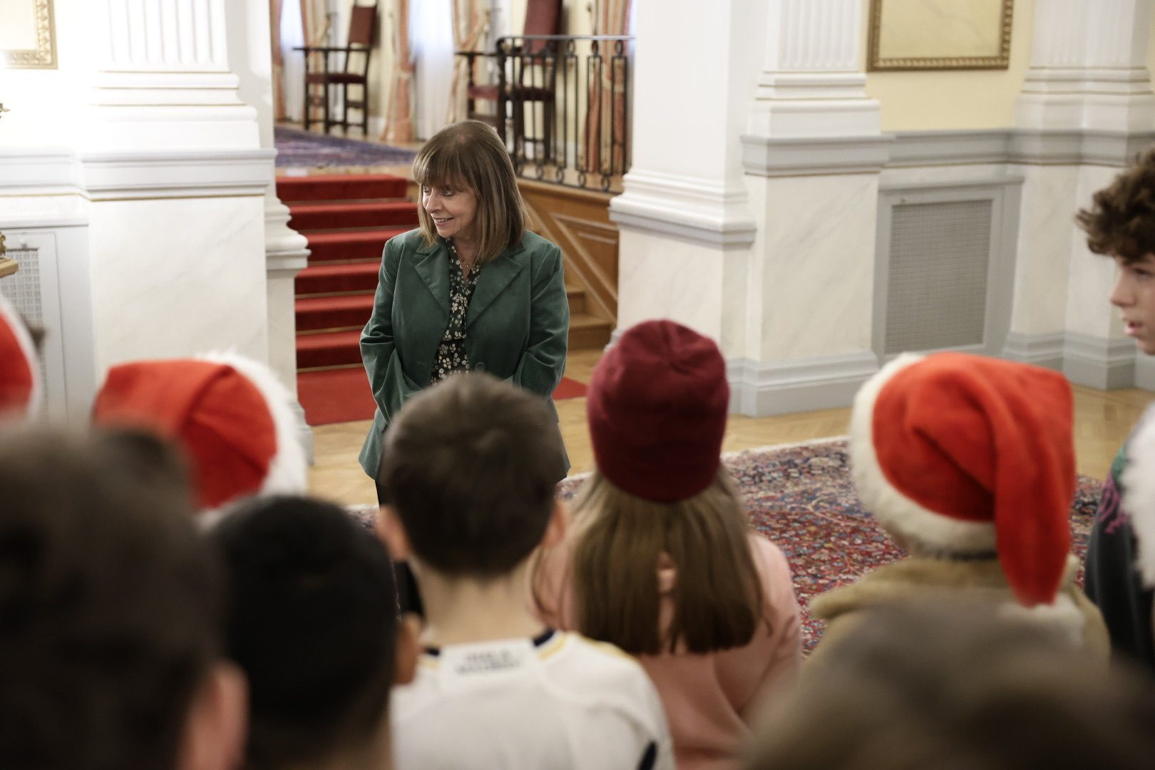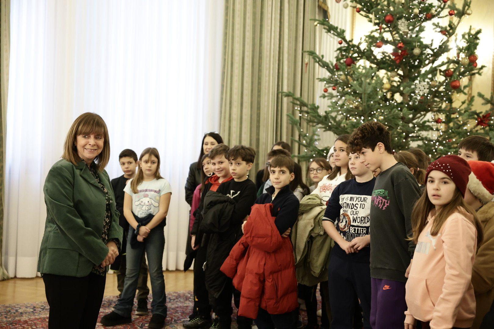 Το χριστουγεννιάτικο δέντρο του Προεδρικού Μεγάρου στόλισαν φέτος μαθητές και μαθήτριες από το 2ο Δημοτικό Σχολείο Πατρών- Στρούμπειο. Η Πρόεδρος της Δημοκρατίας Κατερίνα Σακελλαροπούλου συνομίλησε με τα παιδιά, τα οποία νωρίτερα ξεναγήθηκαν στους χώρους του Μεγάρου και στην Προεδρική Φρουρά.