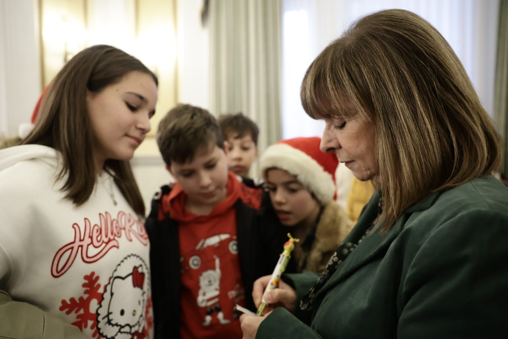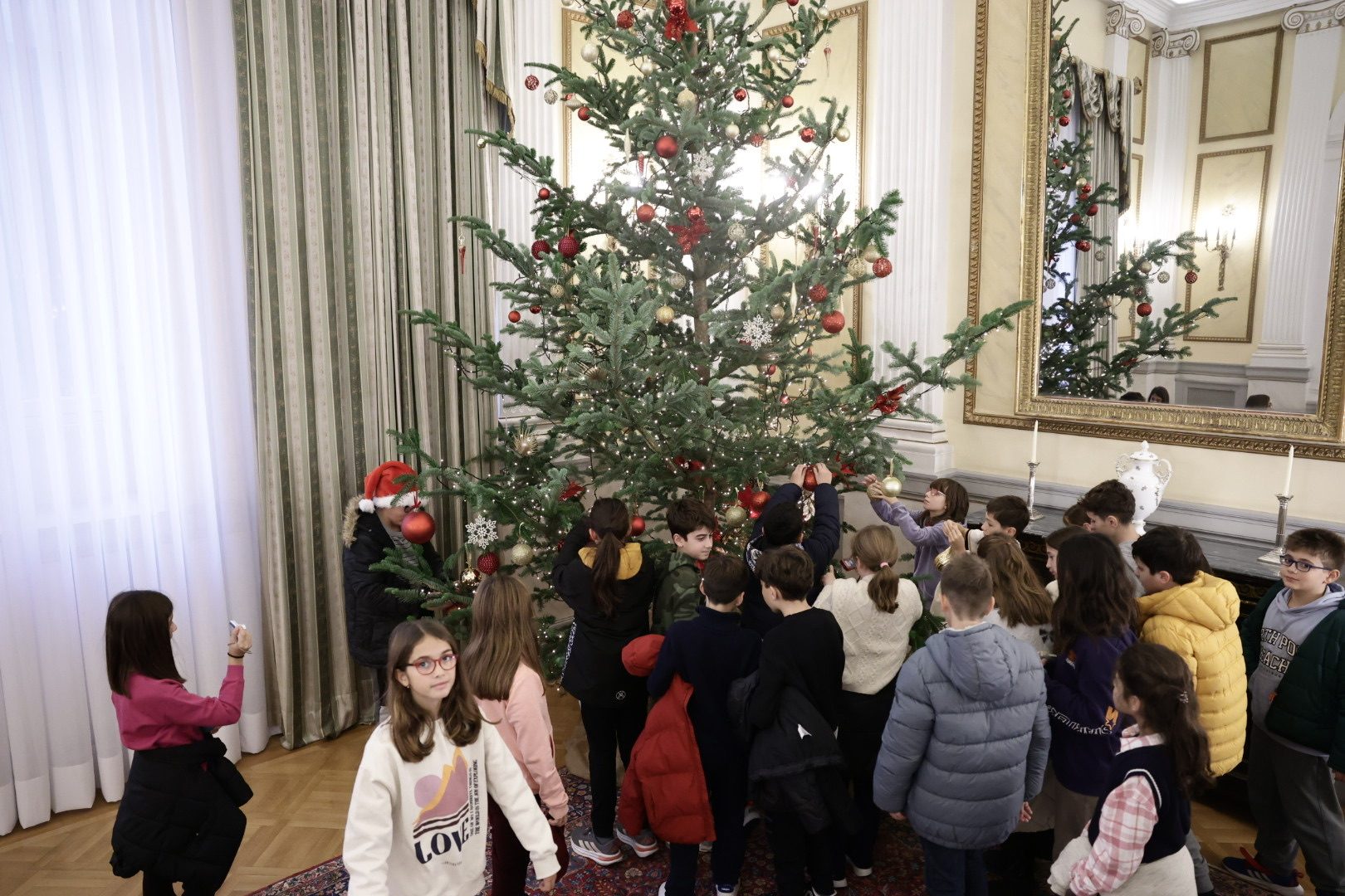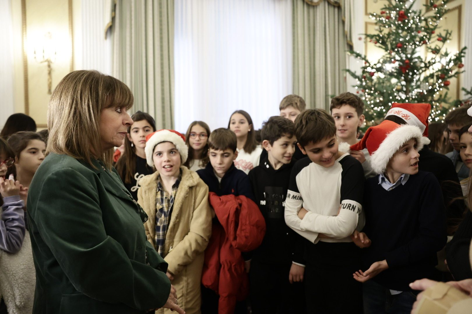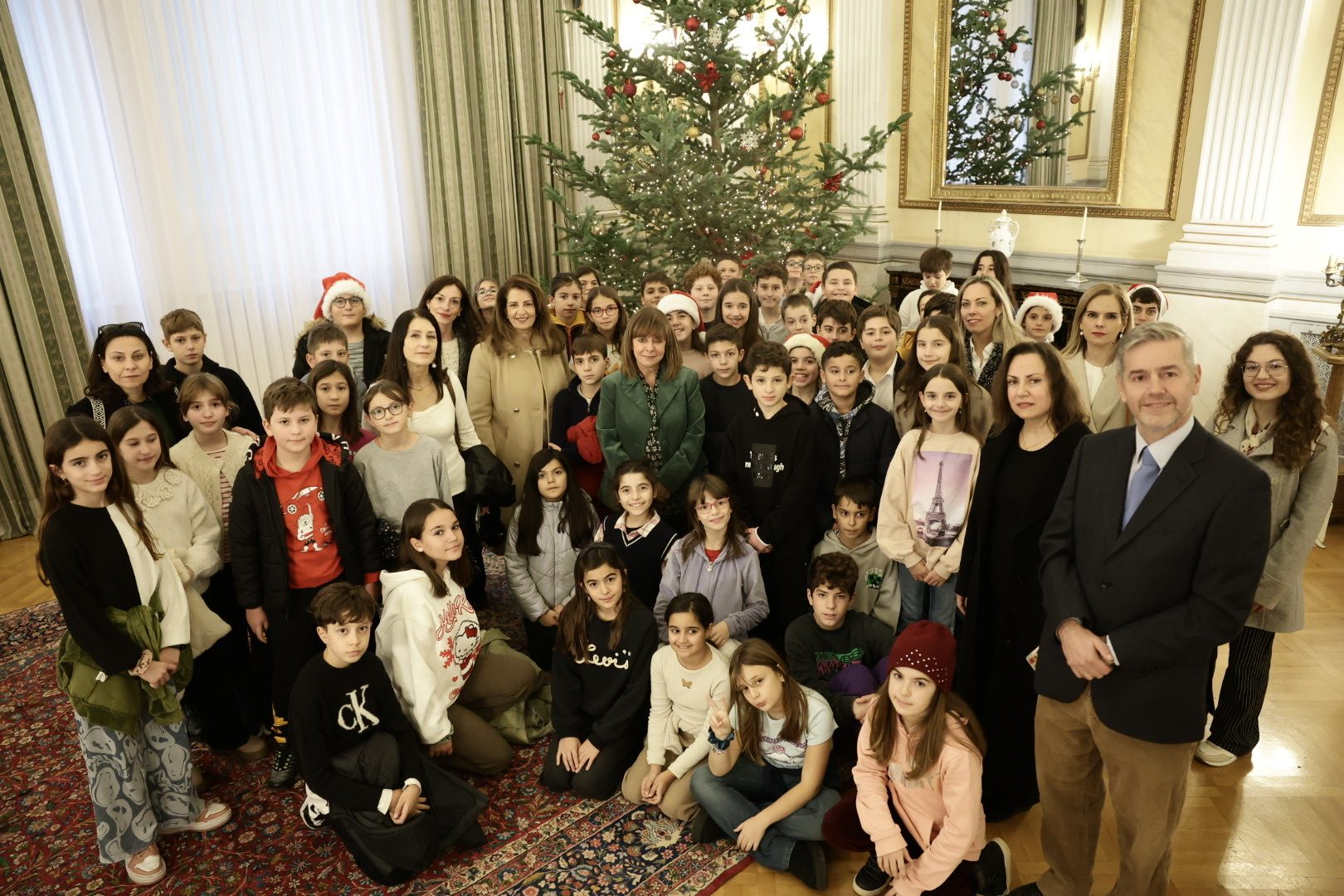 Το χριστουγεννιάτικο δέντρο του Προεδρικού Μεγάρου στόλισαν φέτος μαθητές και μαθήτριες από το 2ο Δημοτικό Σχολείο Πατρών- Στρούμπειο. Η Πρόεδρος της Δημοκρατίας Κατερίνα Σακελλαροπούλου συνομίλησε με τα παιδιά, τα οποία νωρίτερα ξεναγήθηκαν στους χώρους του Μεγάρου και στην Προεδρική Φρουρά.