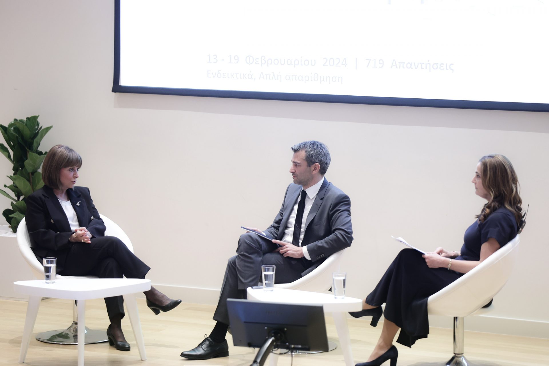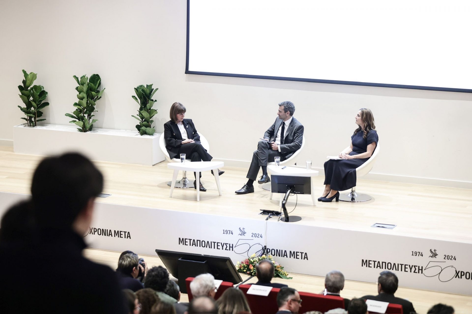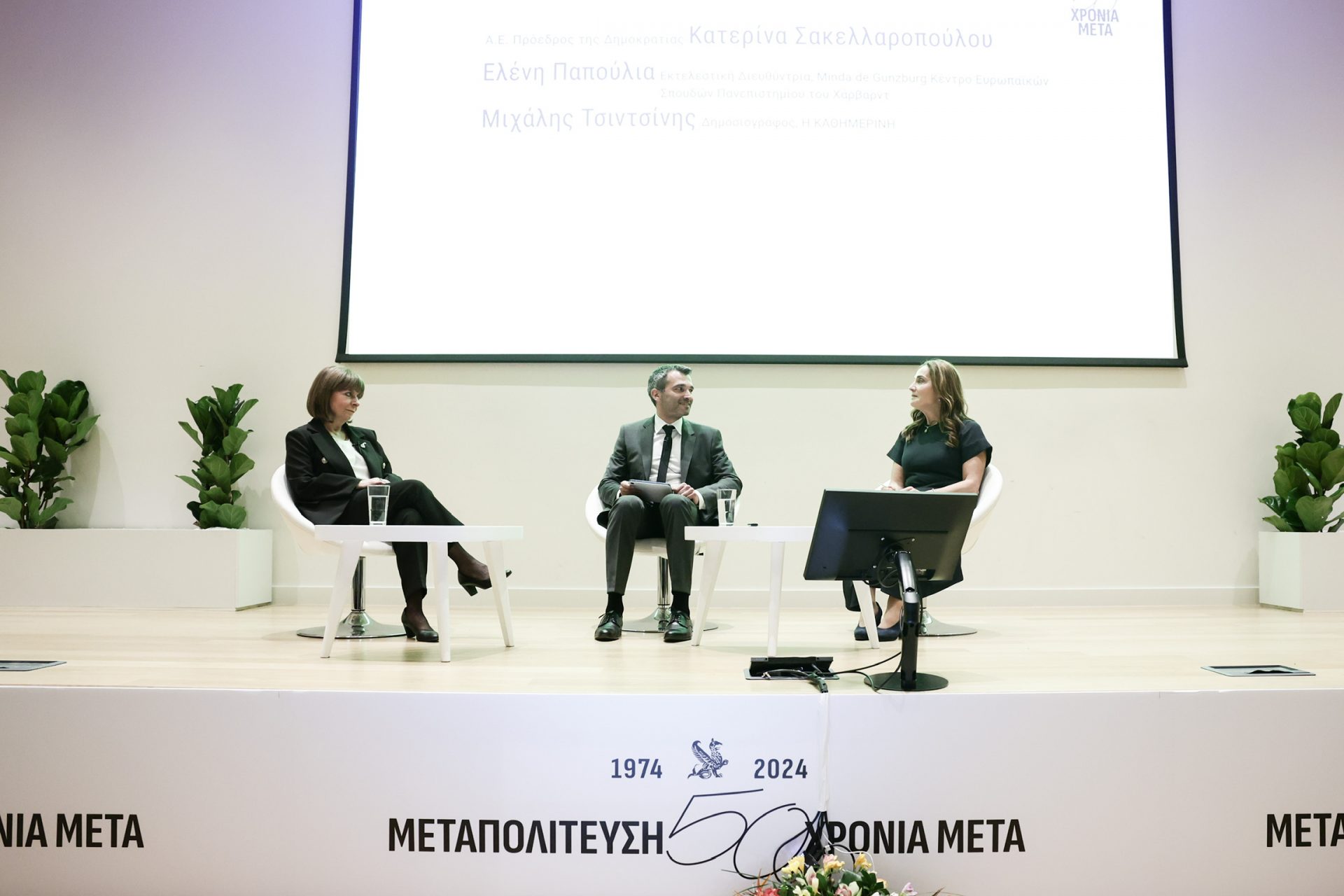 Η Πρόεδρος της Δημοκρατίας Κατερίνα Σακελλαροπούλου συμμετείχε σε συζήτηση με τον δημοσιογράφο της Καθημερινής Μιχάλη Τσιντσίνη και την Ελένη Παπούλια, Εκτελεστική Διευθύντρια του Minda de Gunzburg Center for European Studies του Πανεπιστημίου Harvard, στο πλαίσιο του συνεδρίου με θέμα «ΜΕΤΑΠΟΛΙΤΕΥΣΗ: 50 Χρόνια μετά», το οποίο συνδιοργάνωσαν στην Εθνική Πινακοθήκη η εφημερίδα Καθημερινή, το Μορφωτικό Ίδρυμα Εθνικής Τραπέζης, το Οικονομικό Φόρουμ Δελφών και το Ελληνικό Παρατηρητήριο του London School of Economics.