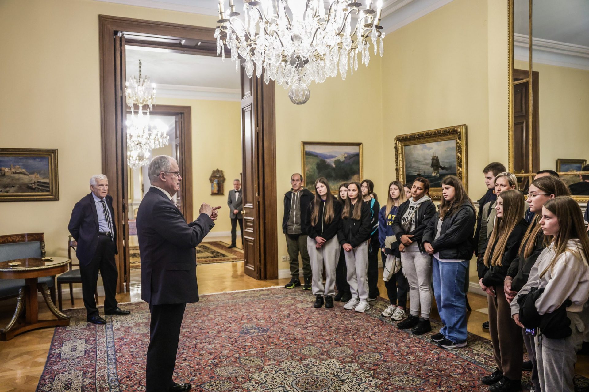 Οι μαθητές, που βρίσκονται στην Αθήνα στο πλαίσιο της 5ημερης εκδρομής τους, ξεναγήθηκαν στο Προεδρικό Μέγαρο και συνομίλησαν με τον Πρόεδρο της Δημοκρατίας για την ιστορία του κτιρίου, τις αρμοδιότητες του Προέδρου της Δημοκρατίας και τις βασικές αρχές του πολιτεύματος.