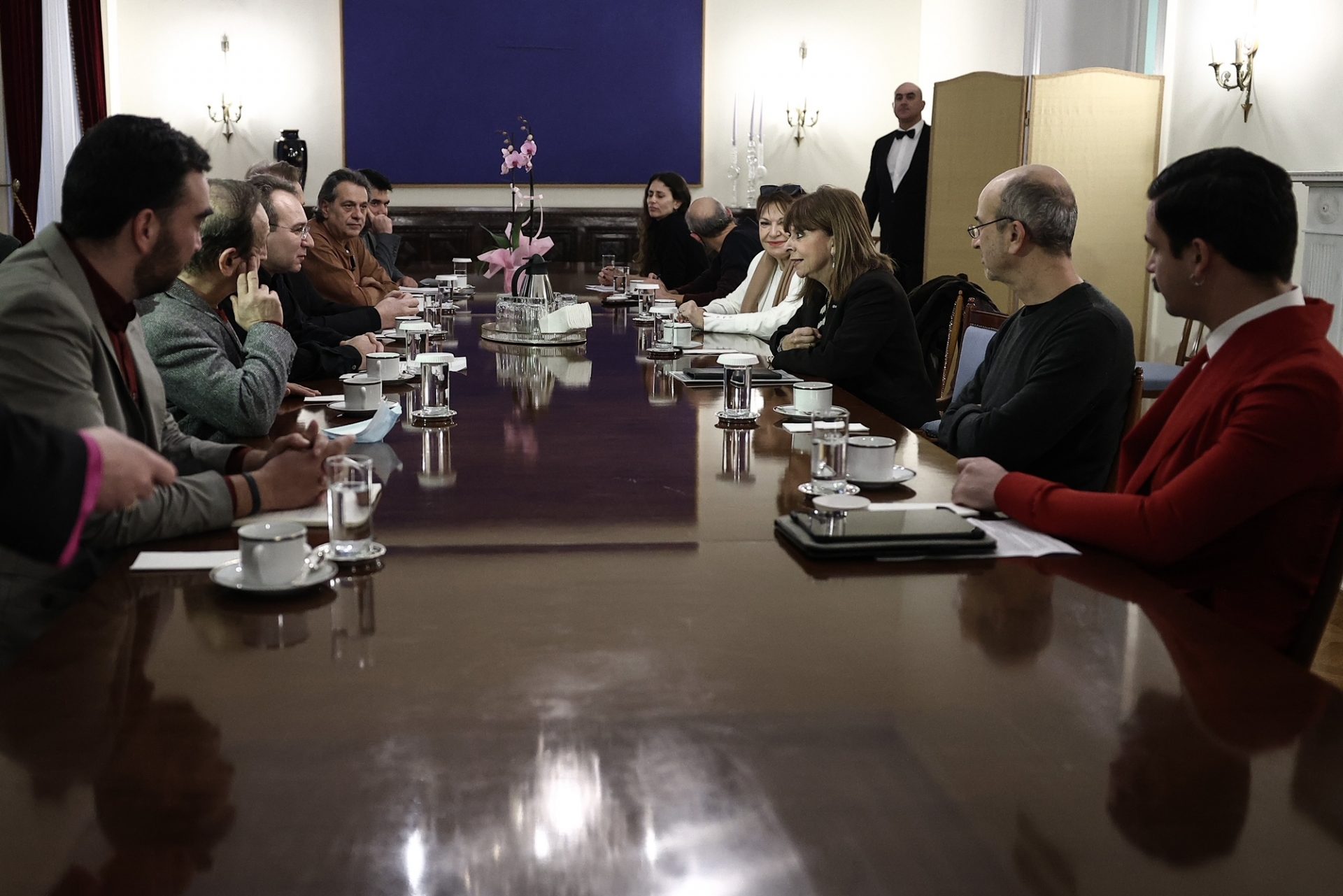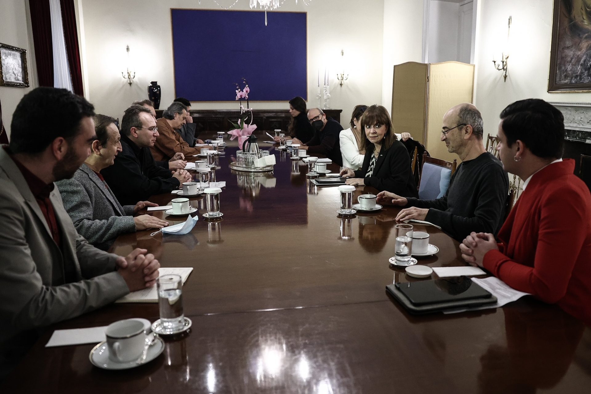 Η Πρόεδρος της Δημοκρατίας Κατερίνα Σακελλαροπούλου δέχθηκε στο Προεδρικό Μέγαρο προέδρους Σωματείων καλλιτεχνών, καθώς και εκπροσώπους καθηγητών και σπουδαστών της Δραματικής Σχολής του Εθνικού Θεάτρου, οι οποίοι την ενημέρωσαν για τις θέσεις τους αναφορικά με το Προεδρικό Διάταγμα 85/2022 «Καθορισμός προσόντων διορισμού σε φορείς του Δημοσίου (Προσοντολόγιο-Κλαδολόγιο)» και το συναφές ζήτημα της αδιαβάθμητης καλλιτεχνικής εκπαίδευσης.