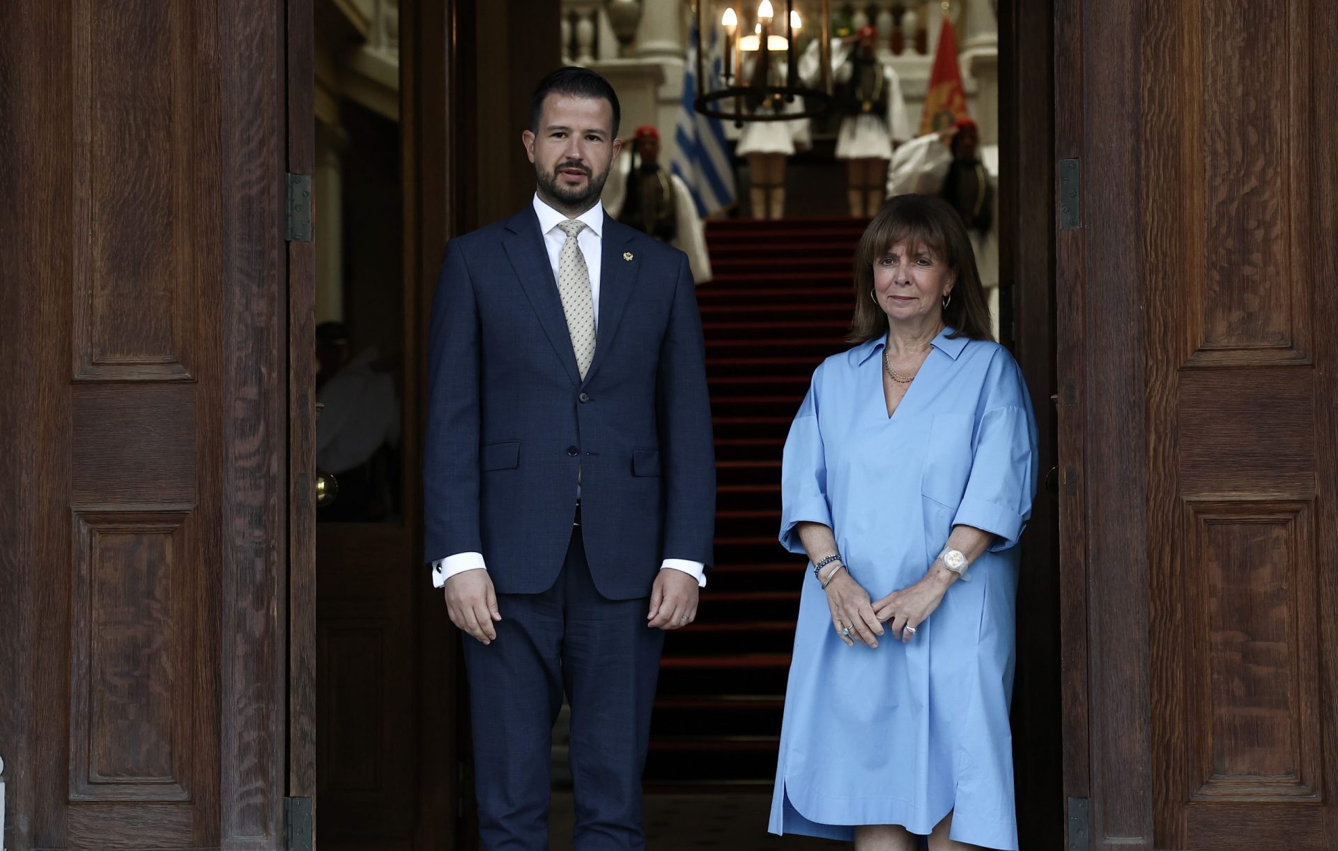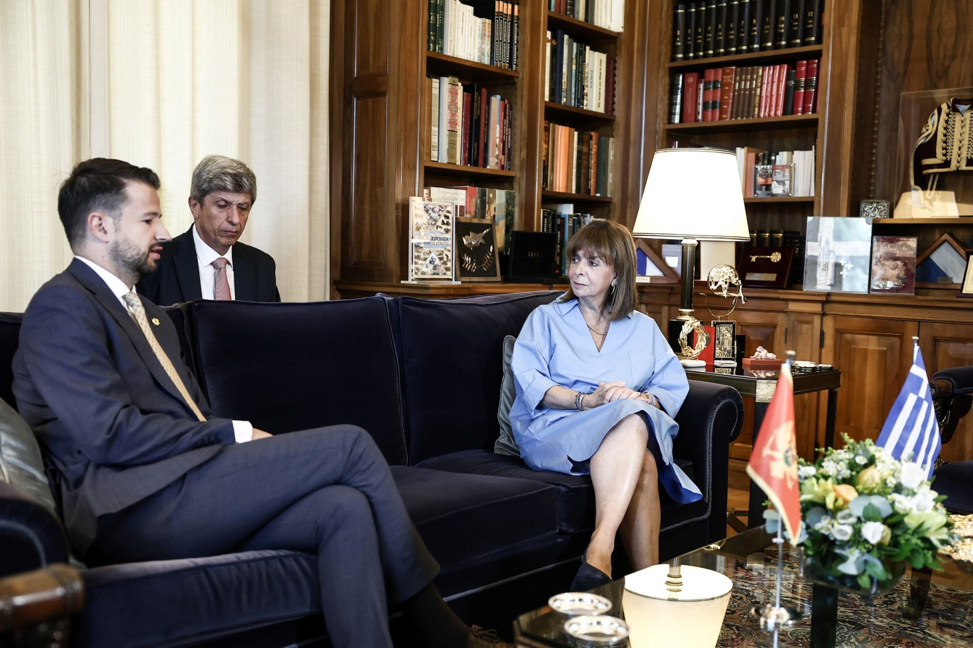 ΚΑΤΕΡΙΝΑ ΣΑΚΕΛΛΑΡΟΠΟΥΛΟΥ: Με ιδιαίτερη χαρά σας καλωσορίζω στην Αθήνα, κύριε Πρόεδρε, και στο Προεδρικό Μέγαρο. Επιτρέψτε μου να σας συγχαρώ για την ανάληψη των καθηκόντων σας. Οι χώρες μας, οι λαοί μας, συνδέονται παραδοσιακά με στενούς δεσμούς φιλίας και ελπίζω ότι κάθε συνάντηση, όπως η σημερινή, συμβάλλει στην ενίσχυση των διμερών μας σχέσεων.