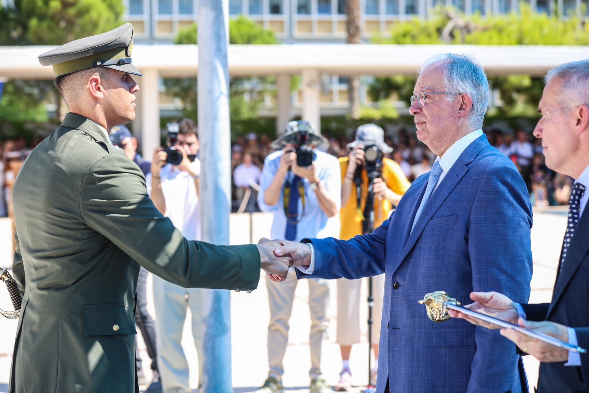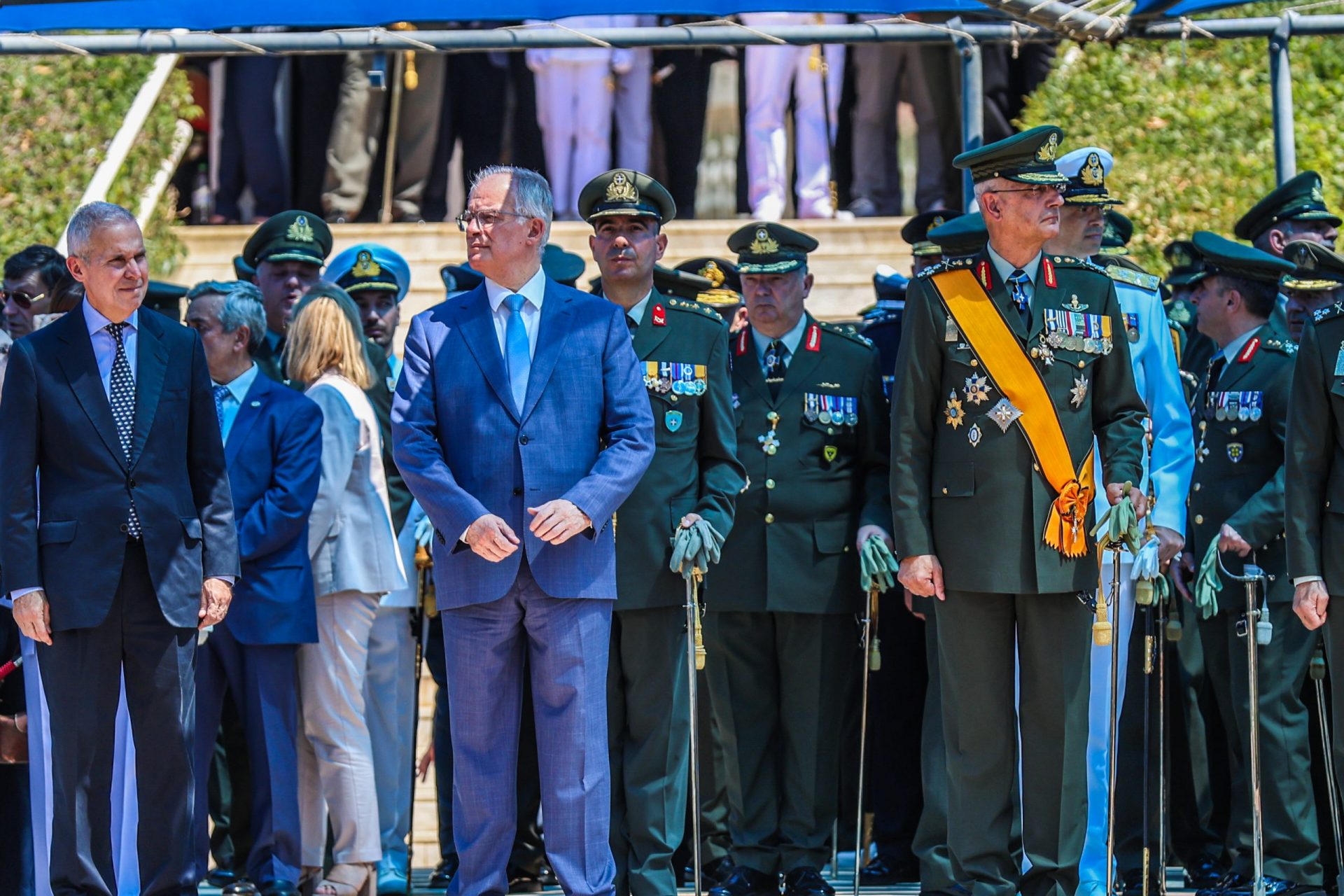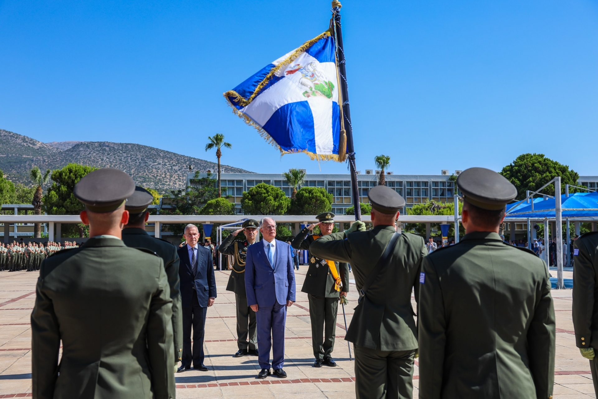 Τον Πρόεδρο της Δημοκρατίας υποδέχθηκε ο Υφυπουργός Εθνικής Άμυνας Αθανάσιος Δαβάκης, ο Αρχηγός του Γενικού Επιτελείου Εθνικής Άμυνας Στρατηγός Δημήτριος Χούπης, ο Αρχηγός του Γενικού Επιτελείου Στρατού Αντιστράτηγος Γεώργιος Κωστίδης και ο Διοικητής της Στρατιωτικής Σχολής Ευελπίδων Υποστράτηγος Αναστάσιος Πολύχρονος.