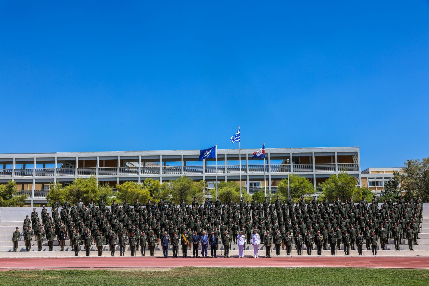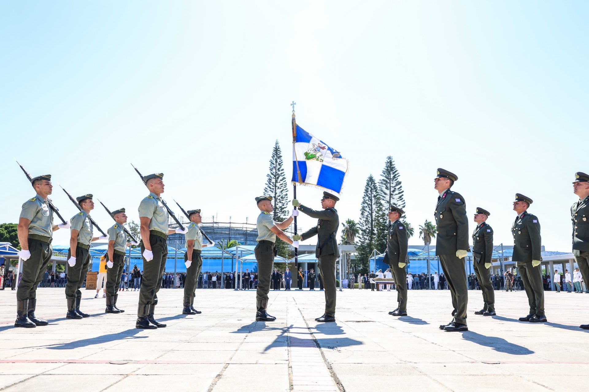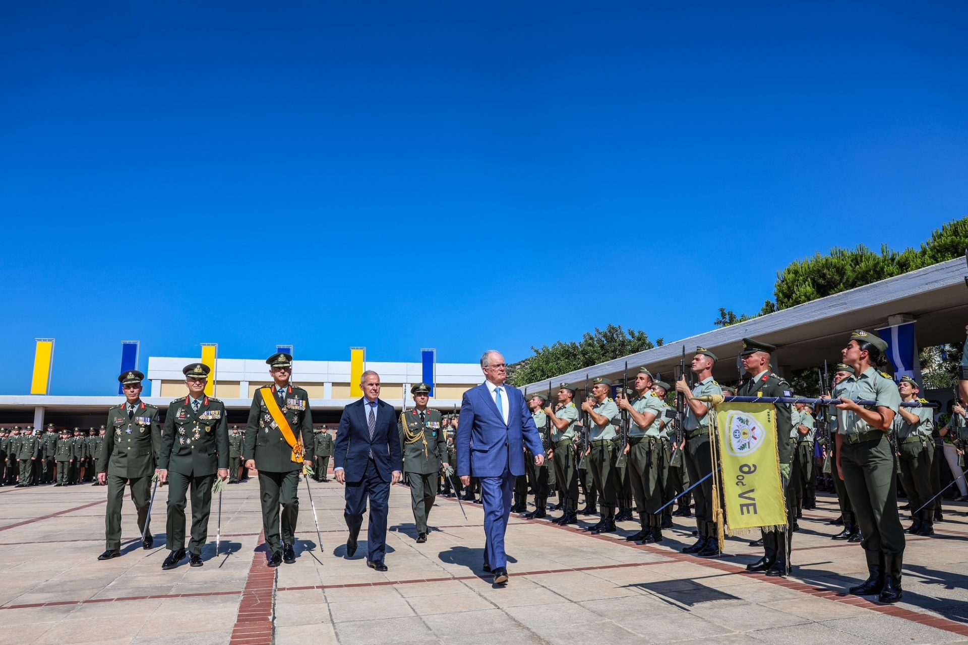 Τον Πρόεδρο της Δημοκρατίας υποδέχθηκε ο Υφυπουργός Εθνικής Άμυνας Αθανάσιος Δαβάκης, ο Αρχηγός του Γενικού Επιτελείου Εθνικής Άμυνας Στρατηγός Δημήτριος Χούπης, ο Αρχηγός του Γενικού Επιτελείου Στρατού Αντιστράτηγος Γεώργιος Κωστίδης και ο Διοικητής της Στρατιωτικής Σχολής Ευελπίδων Υποστράτηγος Αναστάσιος Πολύχρονος.