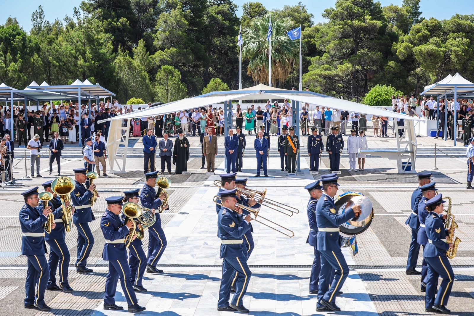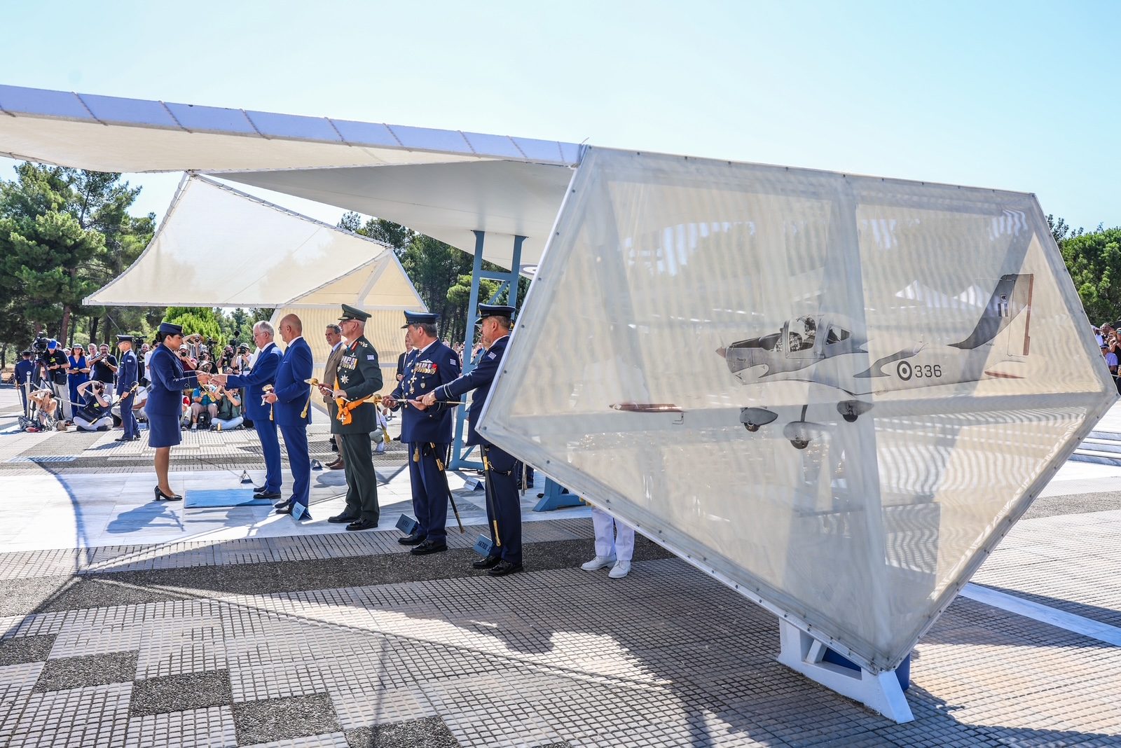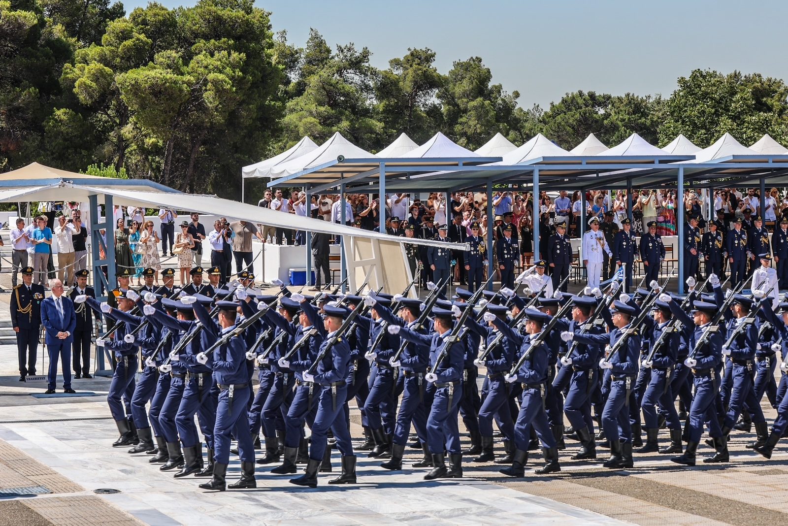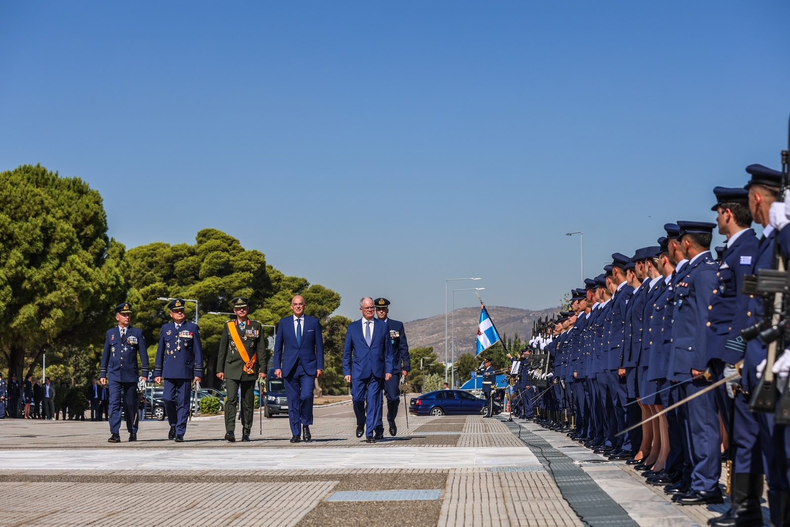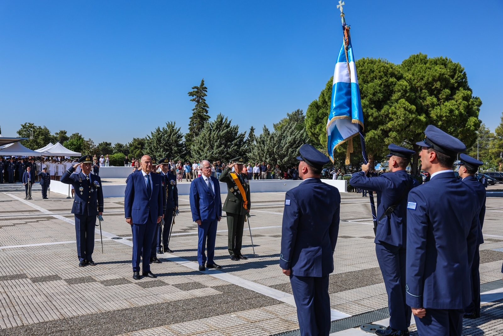 Τον Πρόεδρο της Δημοκρατίας υποδέχθηκε ο Υπουργός Εθνικής Άμυνας Νίκος Δένδιας, ο Αρχηγός του Γενικού Επιτελείου Εθνικής Άμυνας Στρατηγός Δημήτριος Χούπης, ο Αρχηγός του Γενικού Επιτελείου Αεροπορίας Αντιπτέραρχος Δημοσθένης Γρηγοριάδης και ο Διοικητής της Σχολής Ικάρων Υποπτέραρχος Ματθαίος Κανουπάκης.